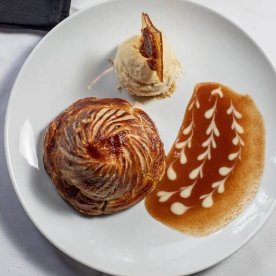 Hojaldre de la casa calientito, relleno de pera y crema de almendra con nuez, acompañado de helado de vainilla, crema de caramelo y su palanqueta.