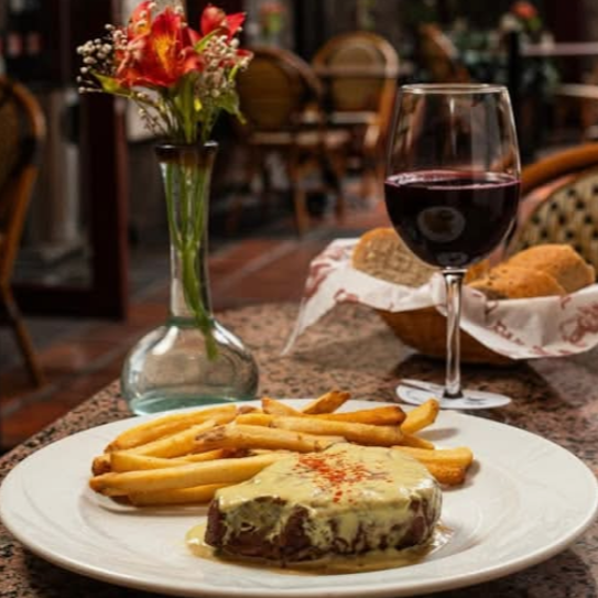 Corazón de filete a la parrilla en salsa de mostaza Dijon y queso roquefort, acompañado de papas a la francesa.