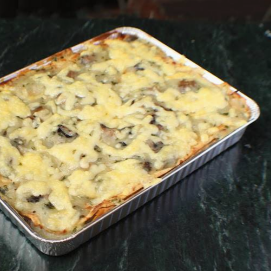 Pastel de crepas de champiñones frescos en salsa de ajo y perejil con queso gruyere (900 g). Elaborado en moldes para 4 personas.