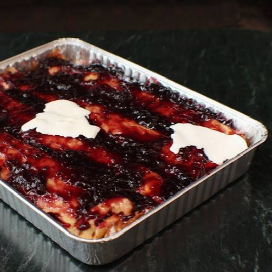 Pastel de crepas de queso cottage, mermelada de zarzamoras de la casa y crema (900 g). Elaborado en moldes para 4 personas.
