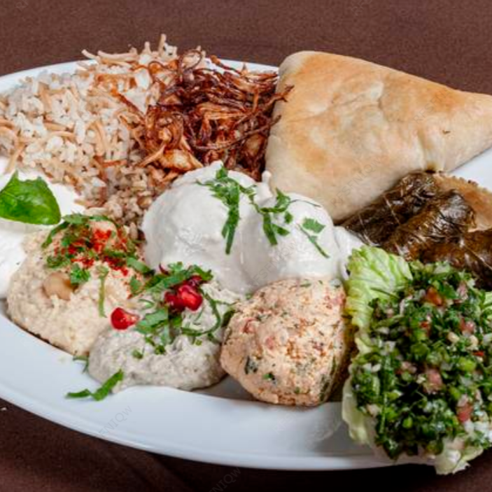 Botana 1 + Plato Mixto, Falafel, arroz con lentejas, pan con queso, Shanklish, Shawarma.