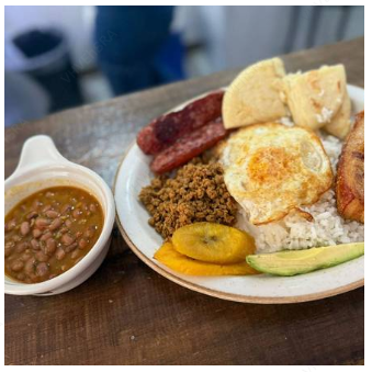 Deliciosa bandeja paisa al mejor estilo colombiano, frijoles, arroz, carne molida, arepa, huevo, chorizo y nuestro delicioso chicharrón pork belly.