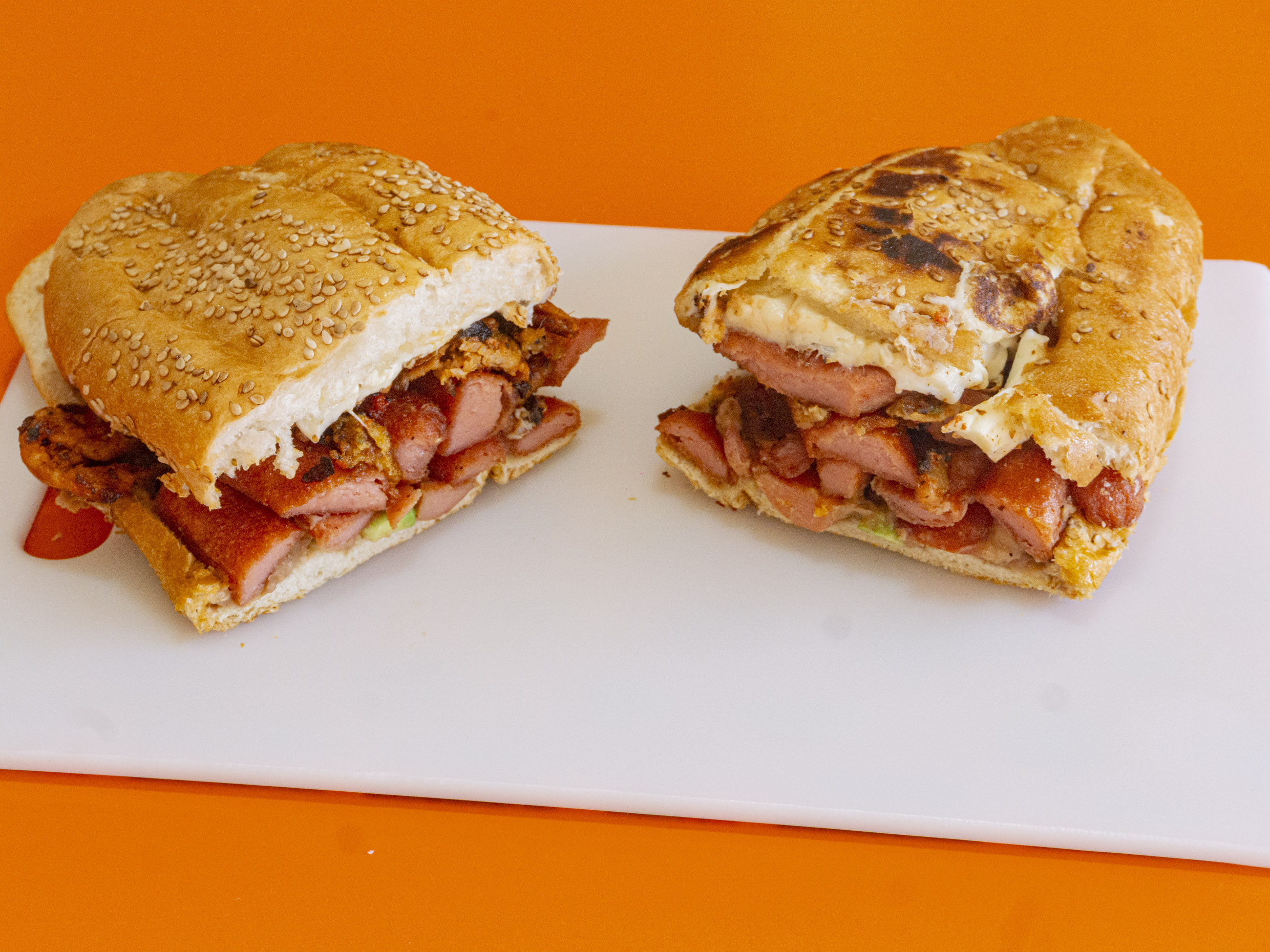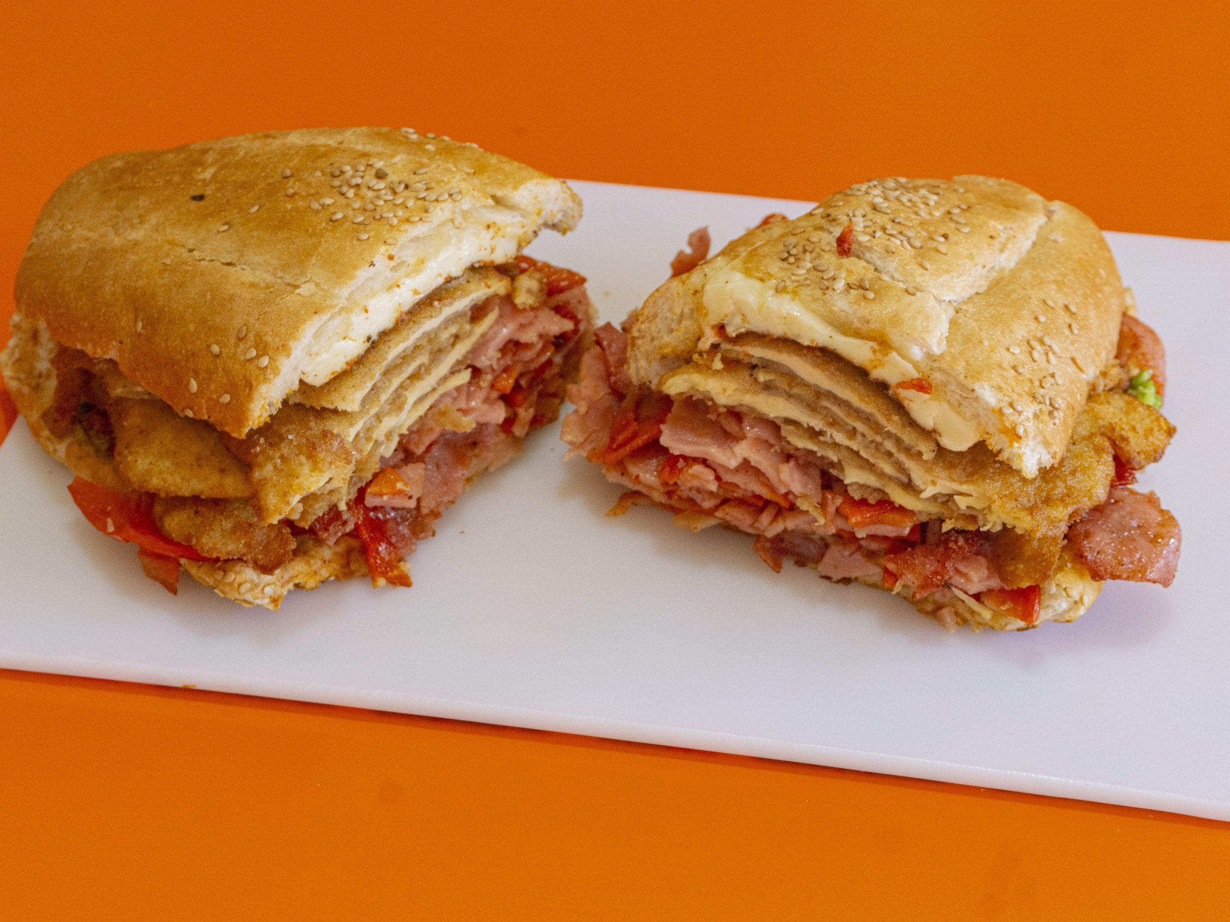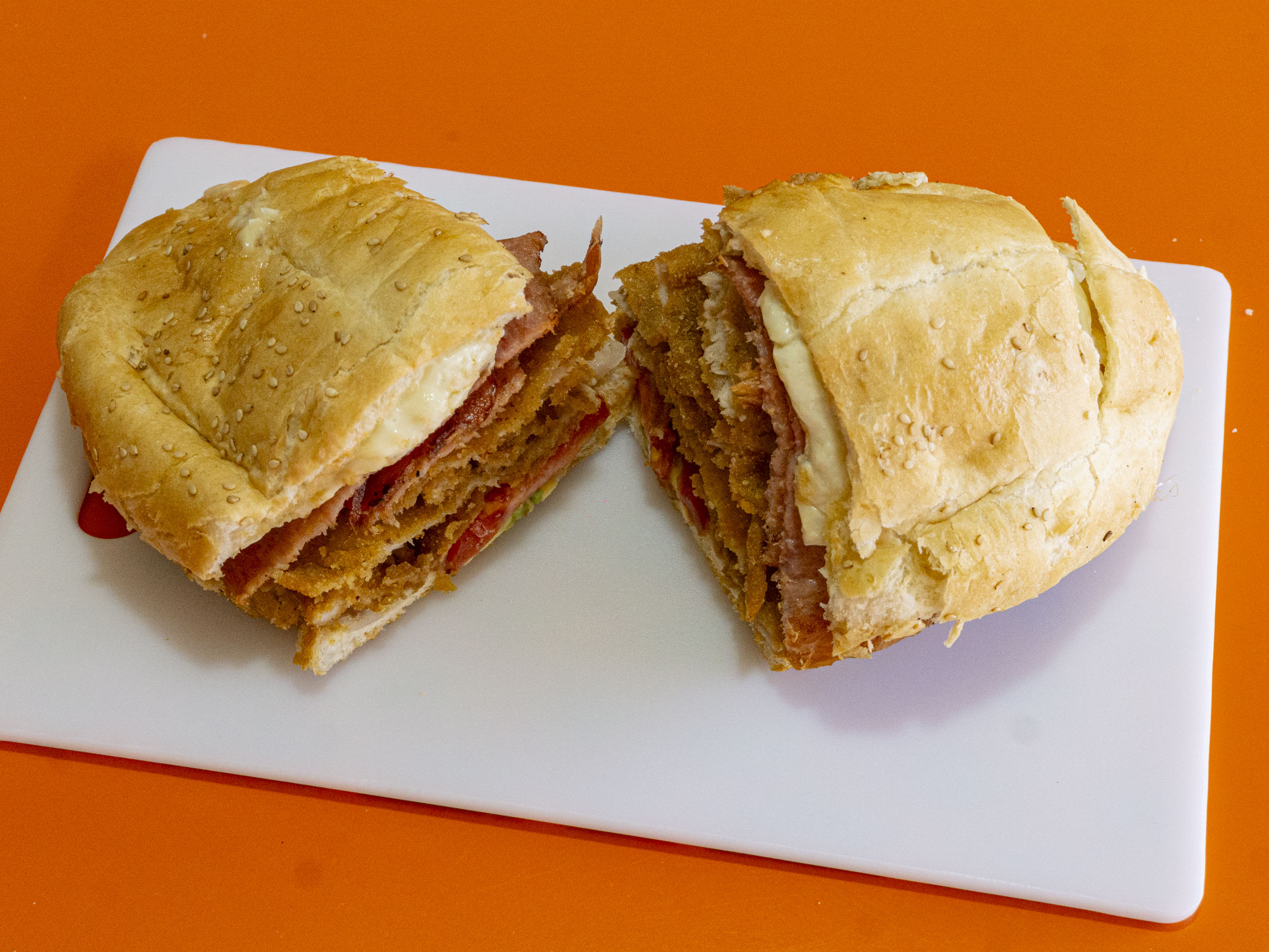 Milanesa de puerco, salchicha y quesillo (esta es la versión CHICA el pan es de 14 a 16 cm)