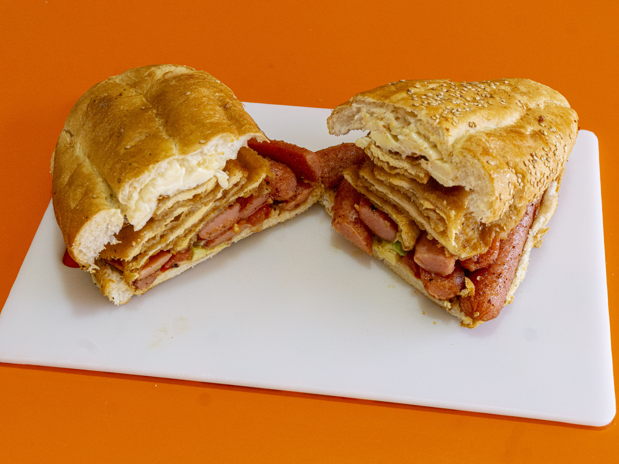 Pierna tortera, salchicha y quesillo (esta es la versión CHICA el pan es de 14 a 16 cm)