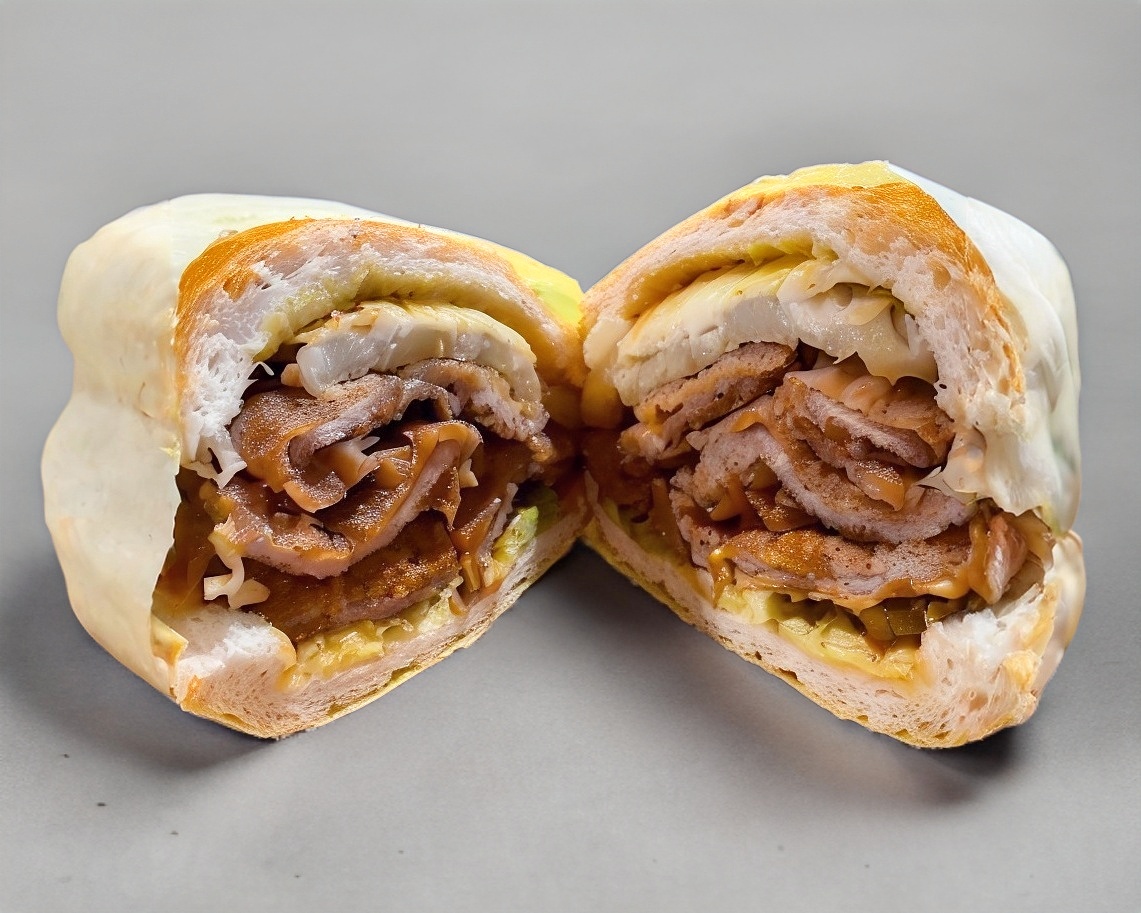 Torta ecatepeña, milanesa de puerco, salchicha de pavo, pierna española, quesillo, mayonesa, mostaza, aguacate, jitomate y picantes. (Porción personal)