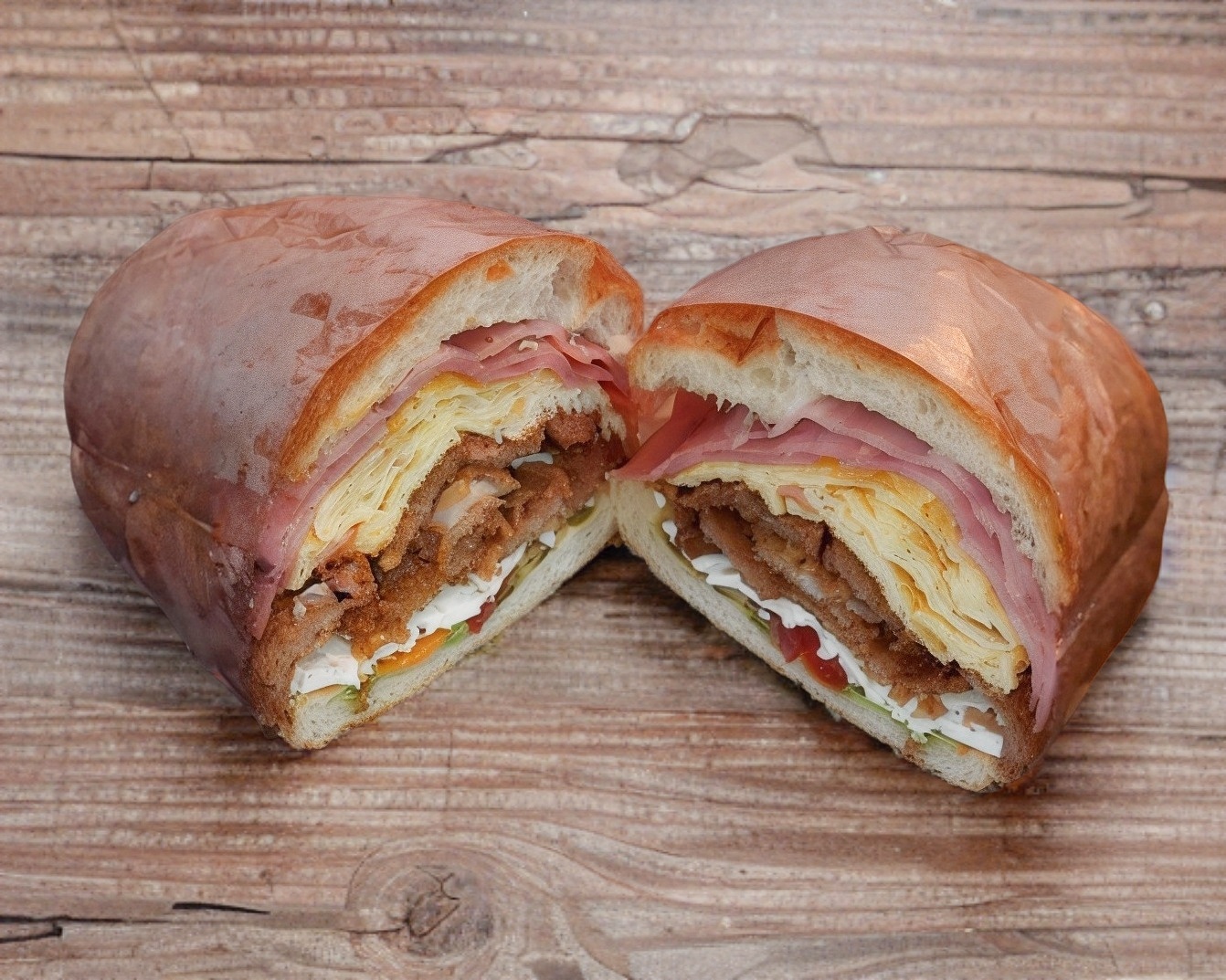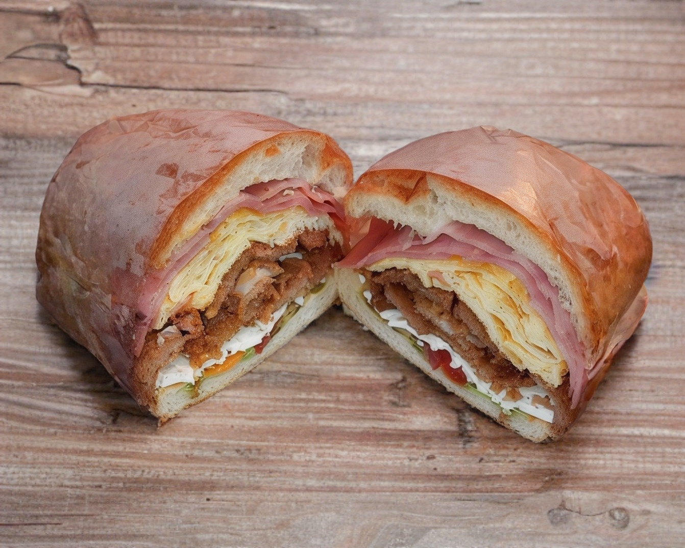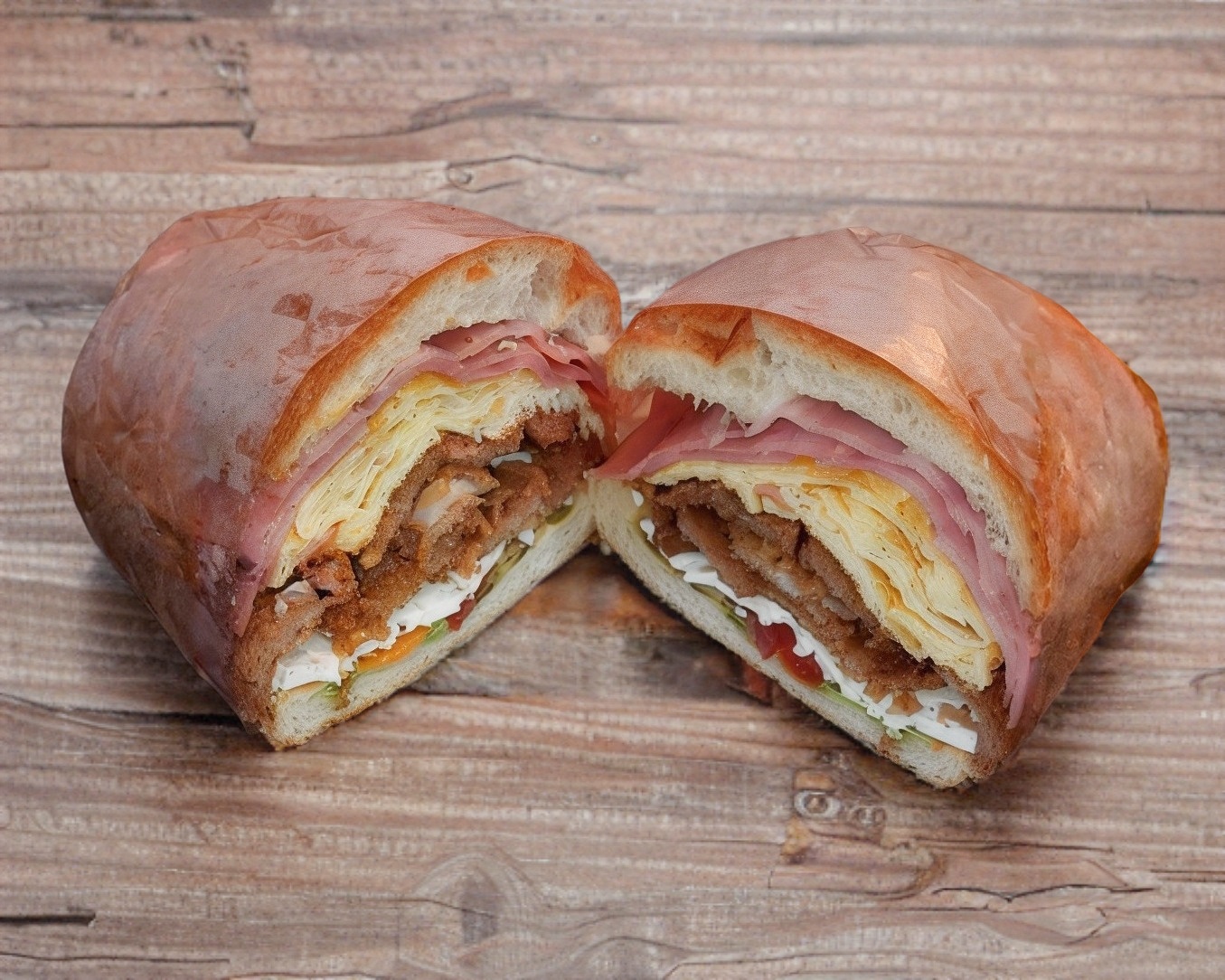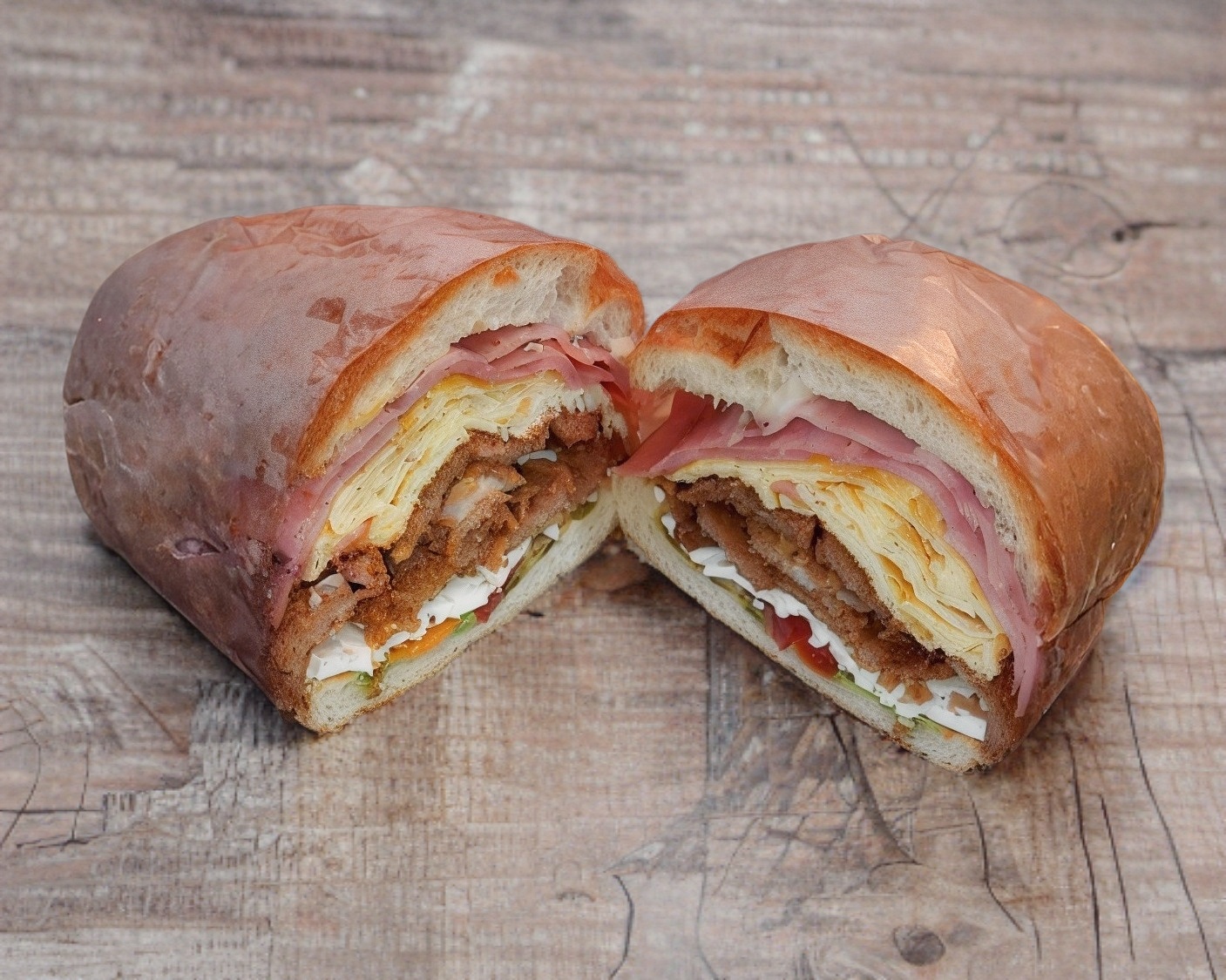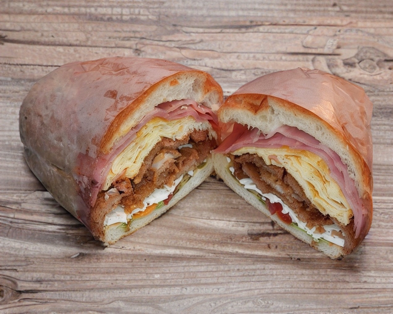Jamón, salchicha y quesillo. Acompañada de verdura, aguacate, tomate, cebolla, mayonesa, picante