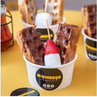 Wafle belga bañado en fondue de chocolate amargo acompañado con una banderilla de fresa y bombon 200gr.
