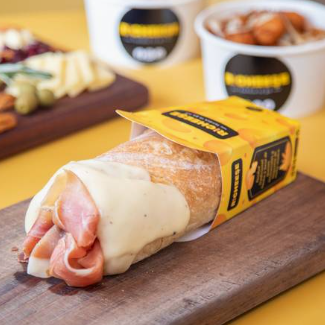 Baguette de masa madre rellena de fondue de tres quesos con tender de pollo envuelto en jamón de pavo 350g.