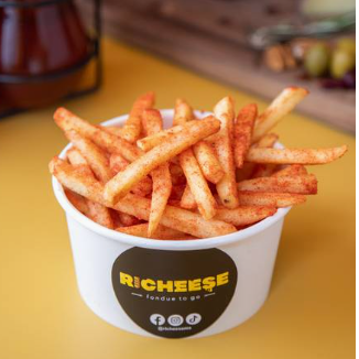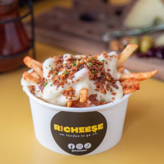 Papas fritas con sazonador richeese con fondue de tres quesos y tocino crujiente 180 g.