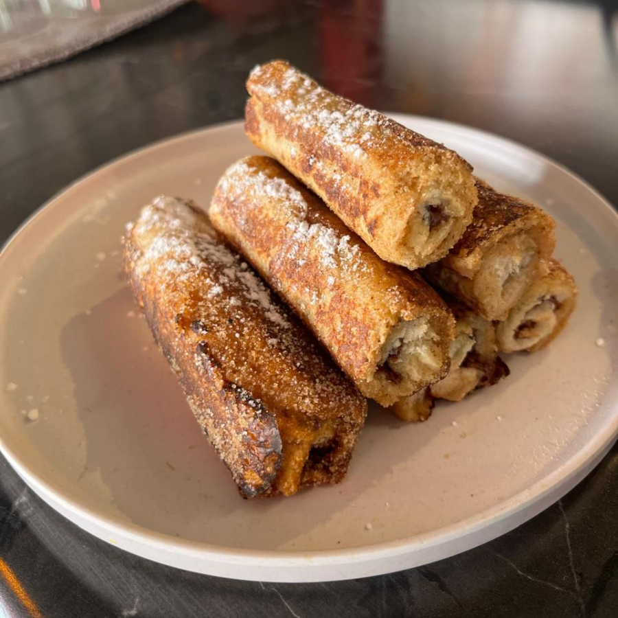 Pan frances enrollado relleno de Nutella espolvoreados en azúcar con canela decorados con lechera y jarabe de chocolate.