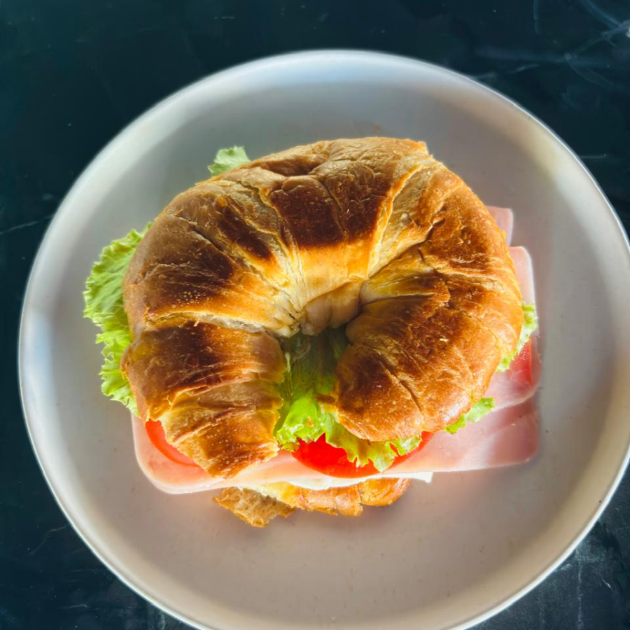 Mini cuernito de Jamón con mayonesa, jitomate, lechuga y queso Oaxaca.