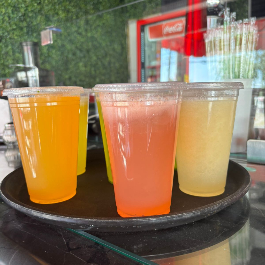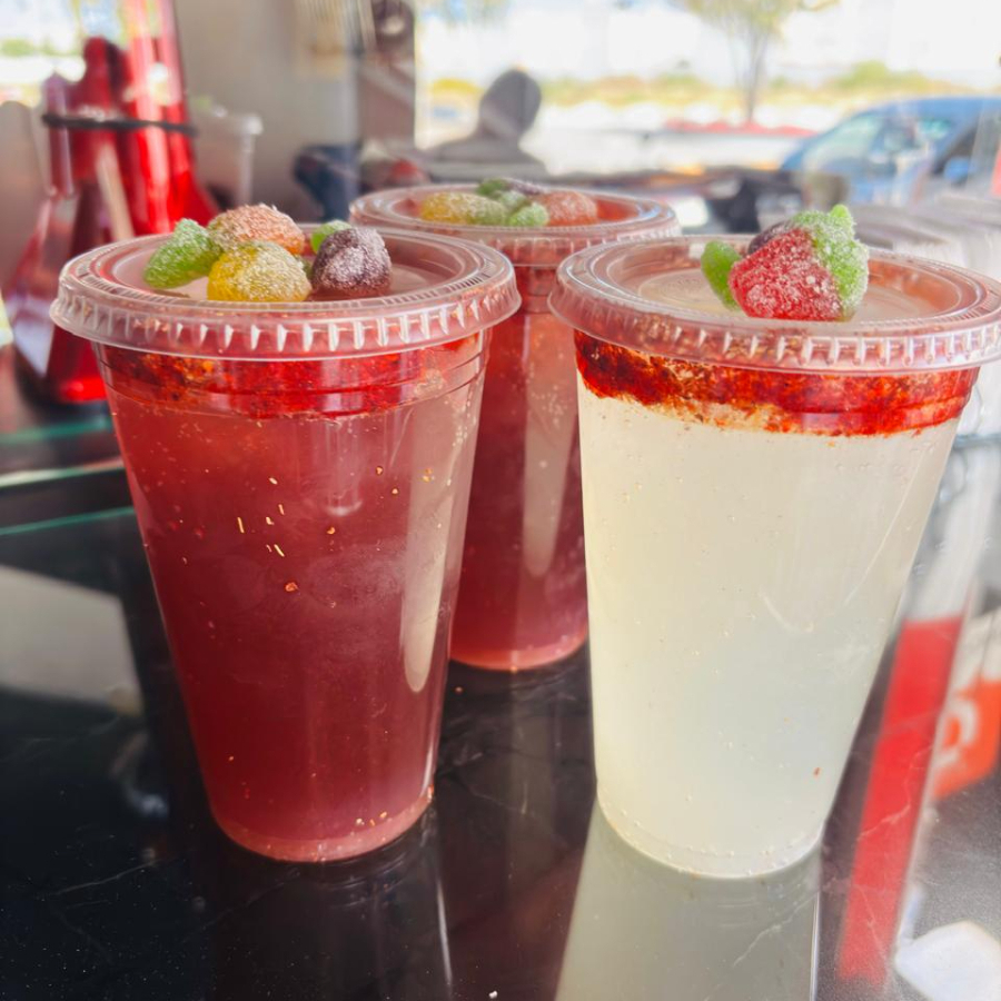 Refresco de tu elección con jugo de limón, sal, escarchado y gomitas.