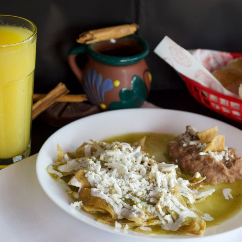 Chilaquiles con salsa y proteína de tu elección con jugo o fruta y café.