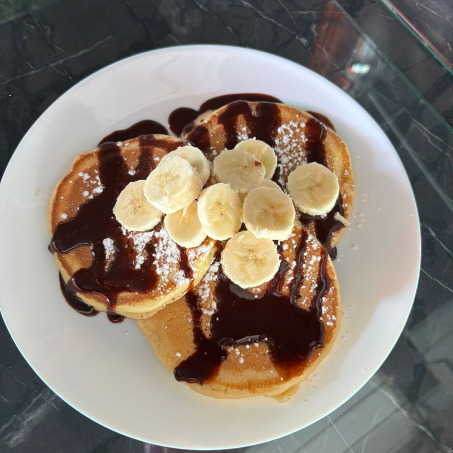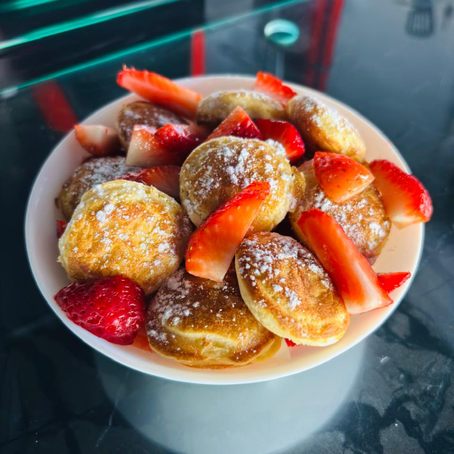 20 Mini pancakes con fruta acompañados de toppings de tu elección.