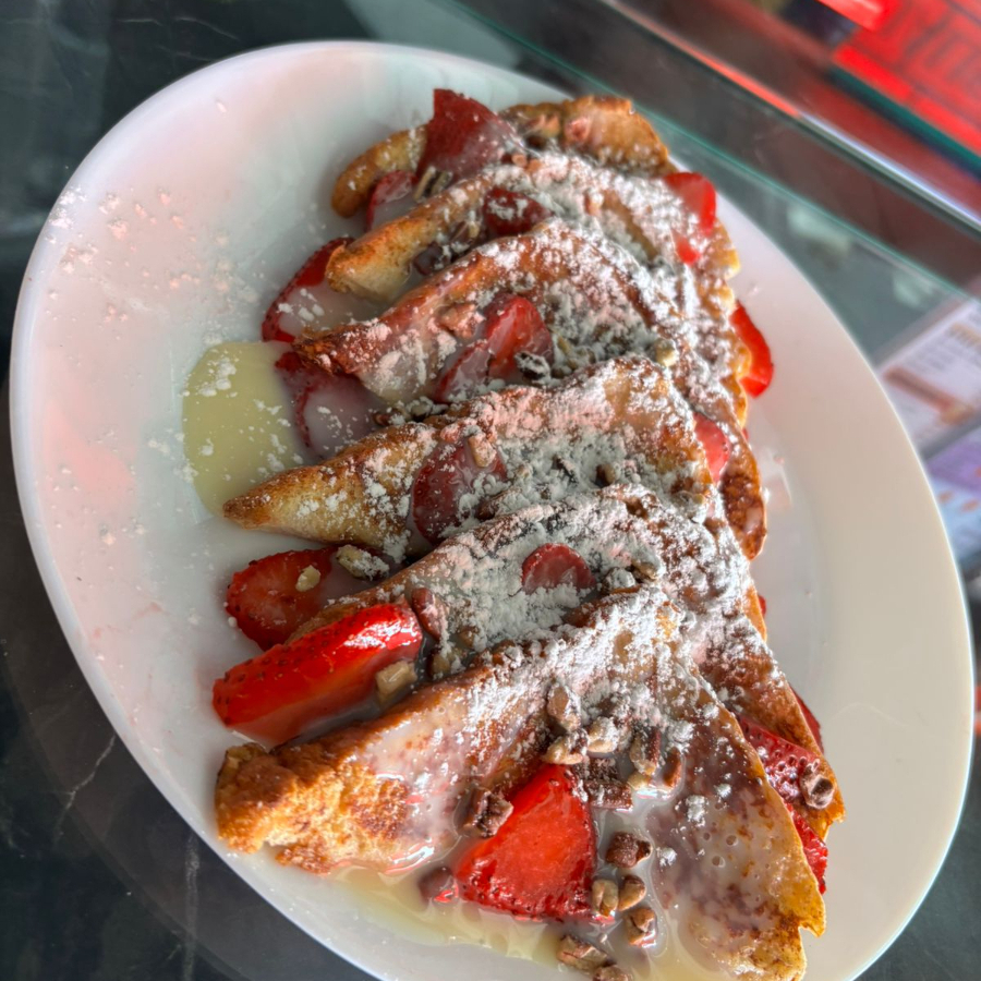 6 rebanadas de pan francés con fruta acompañados de toppings de tu elección.