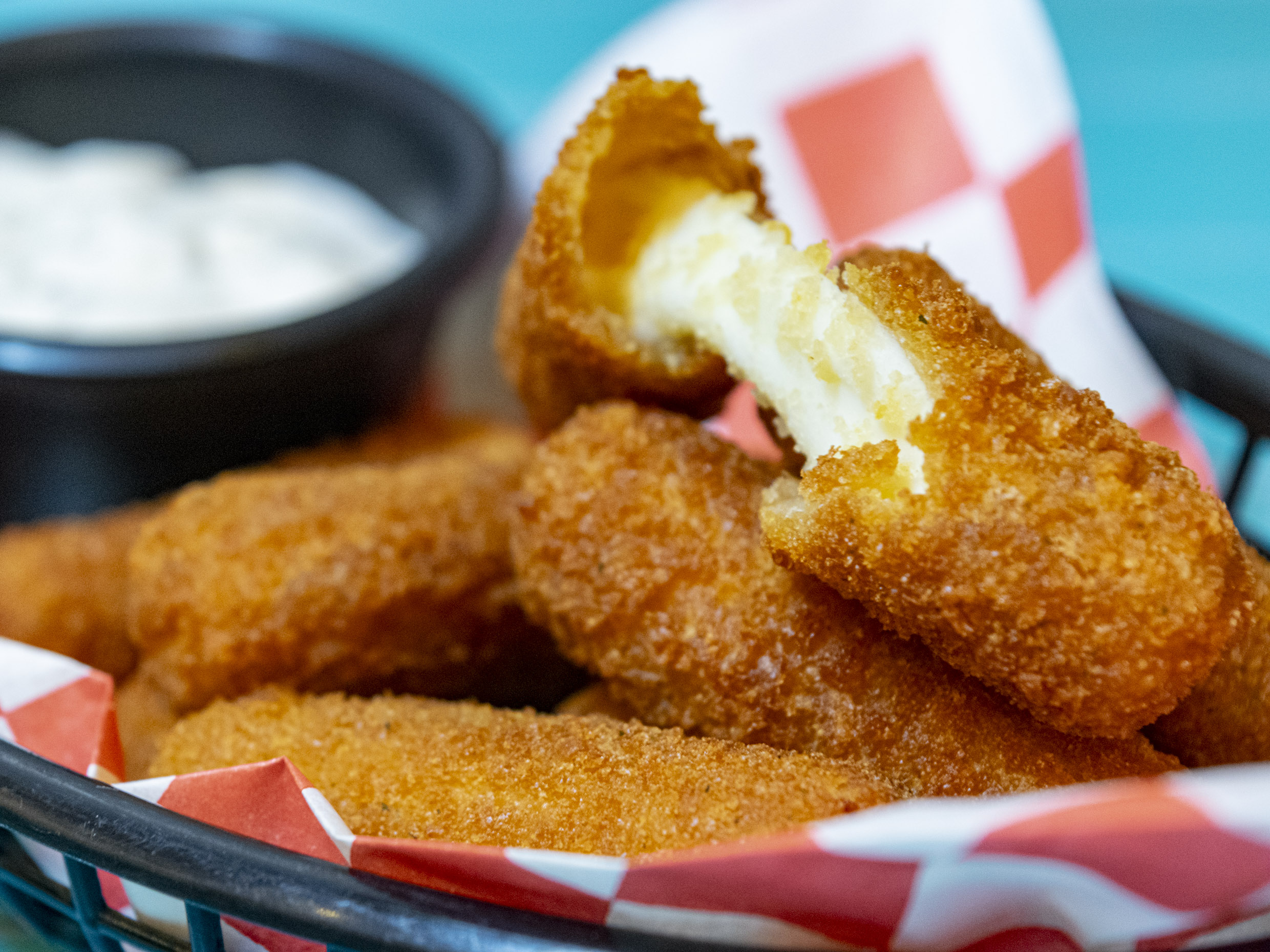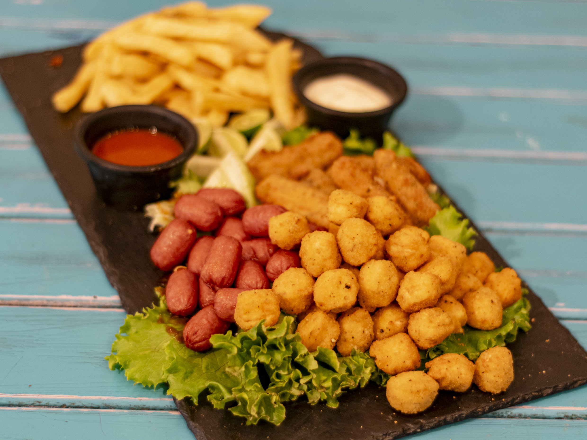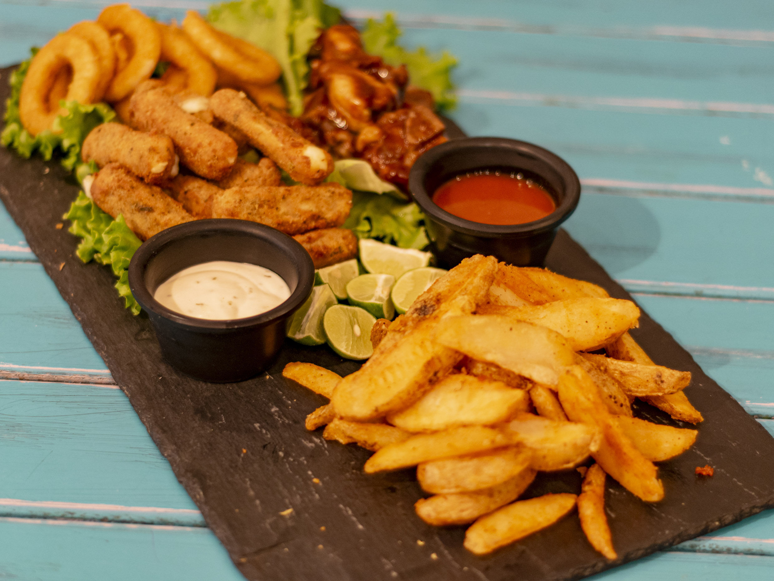 Palitos de mozzarella, costillas, papas gajo y aros de cebolla.