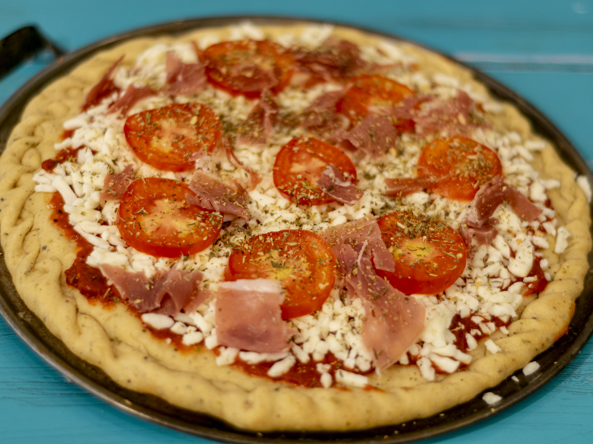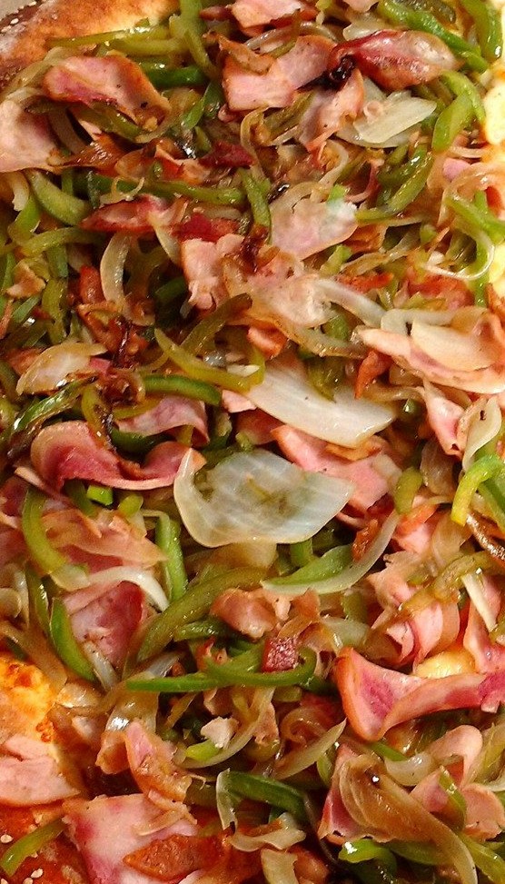Mozzarella, carne molida, tocino, pepperoni y jamón.