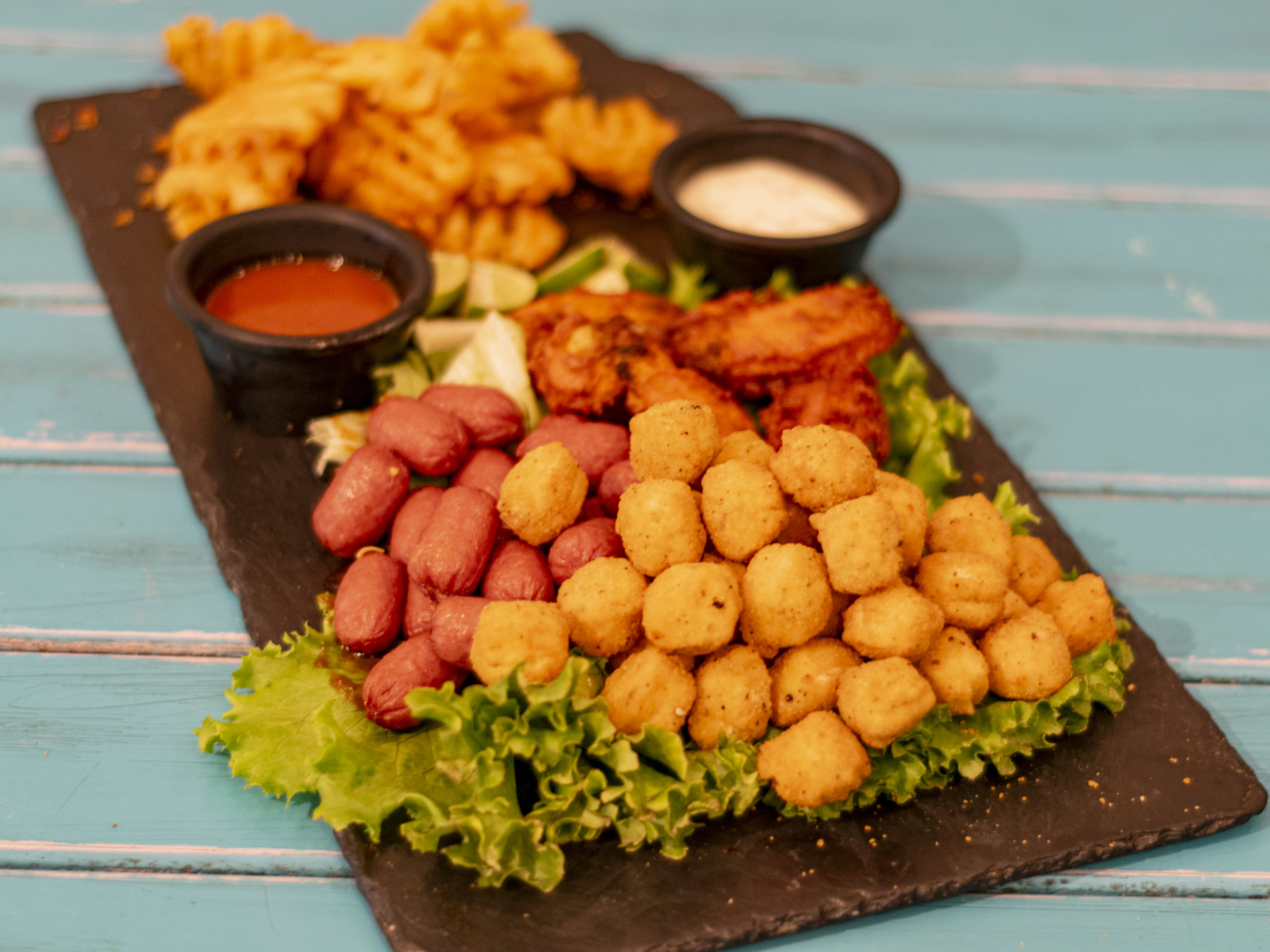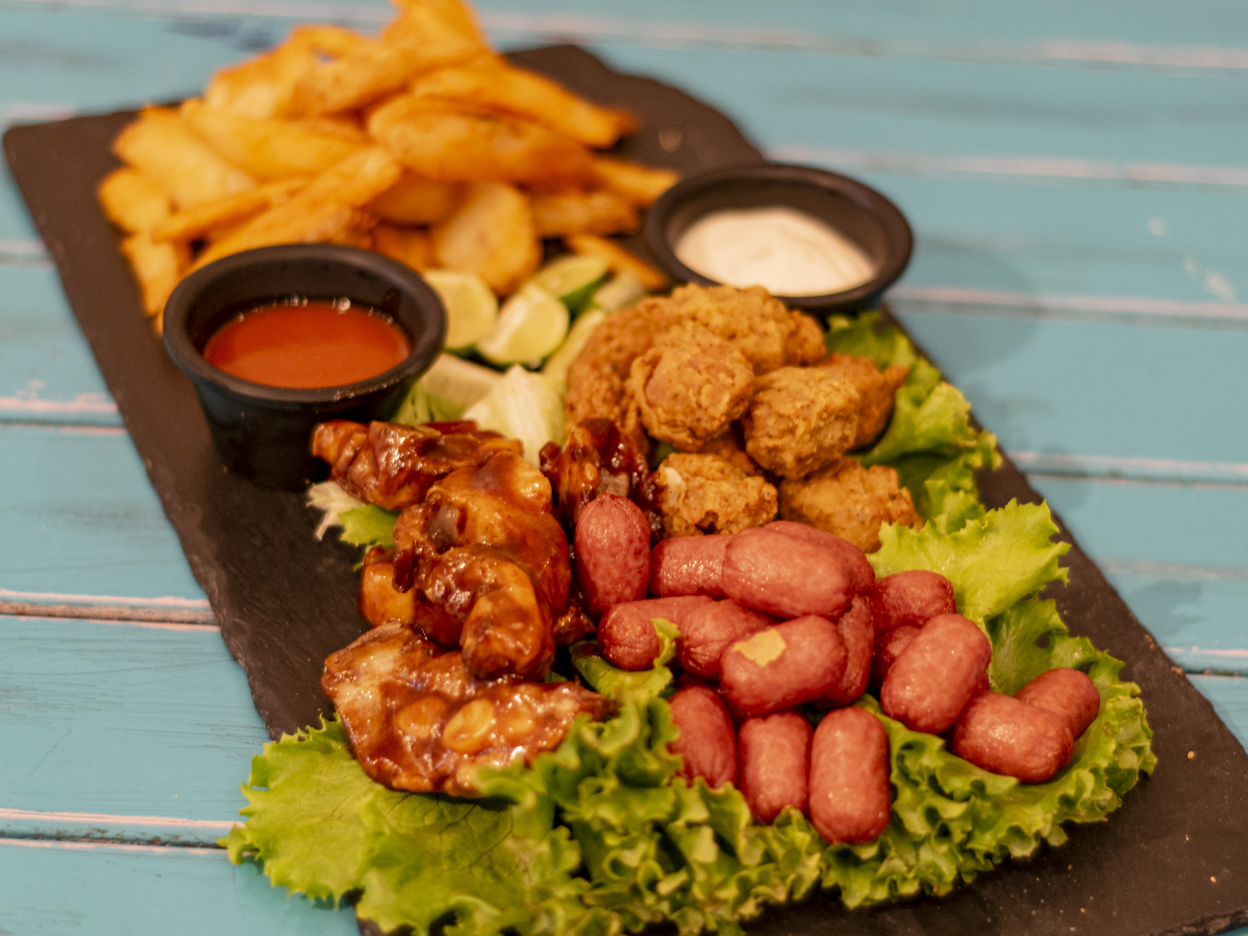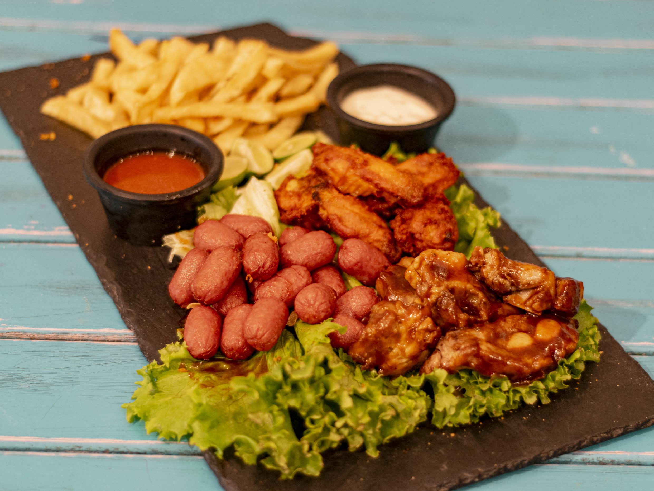 Alitas, papas a la Francesa, mini salchicha y costillas.