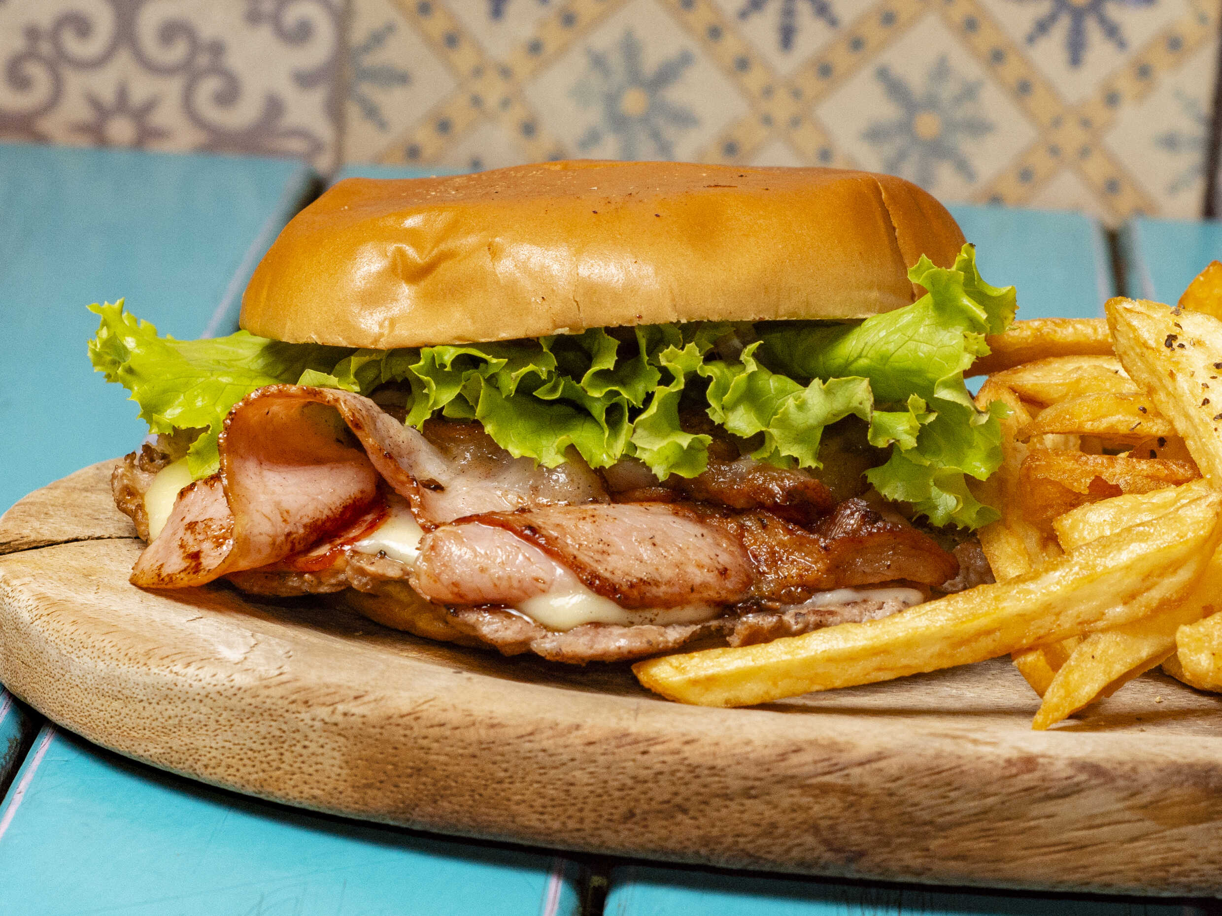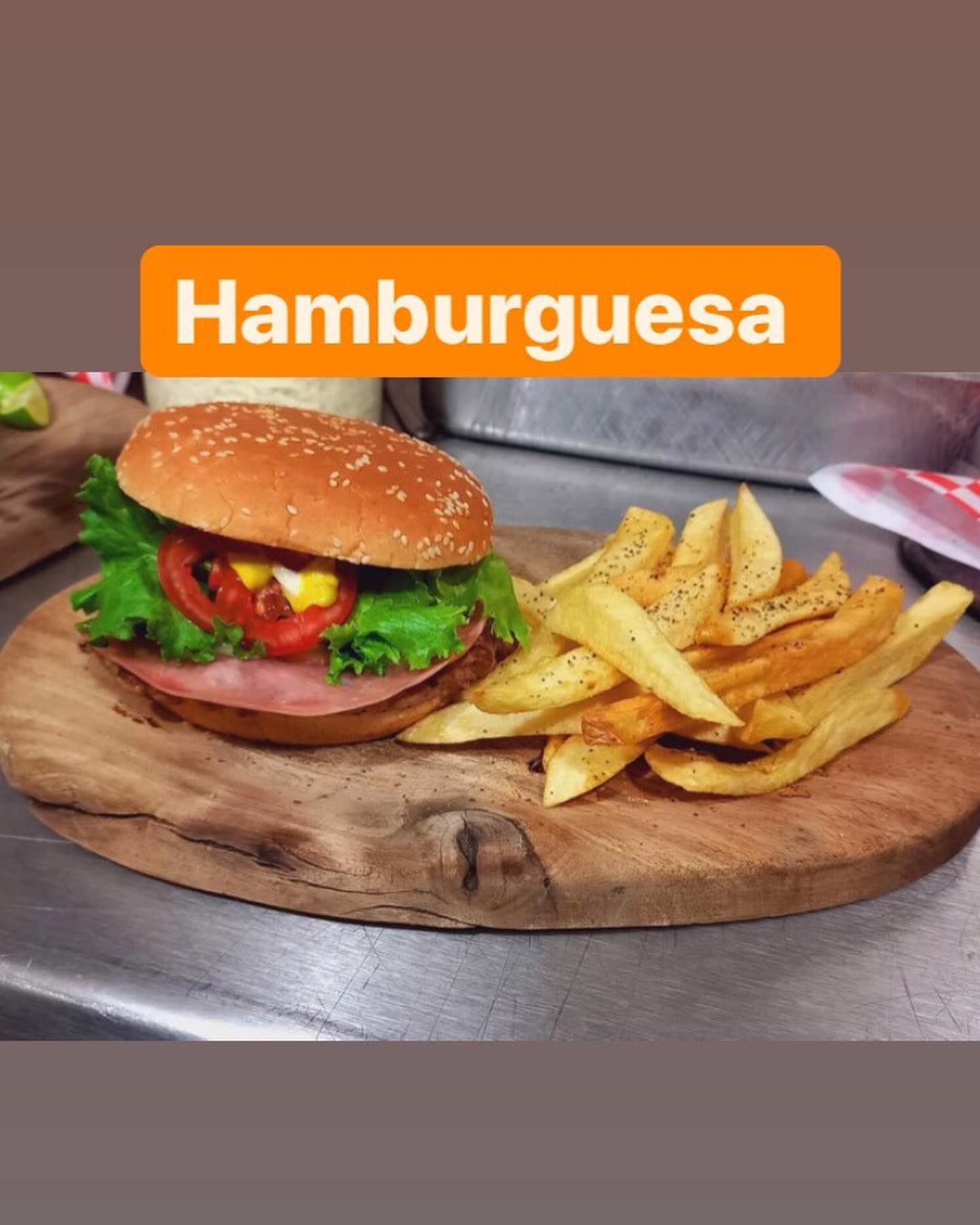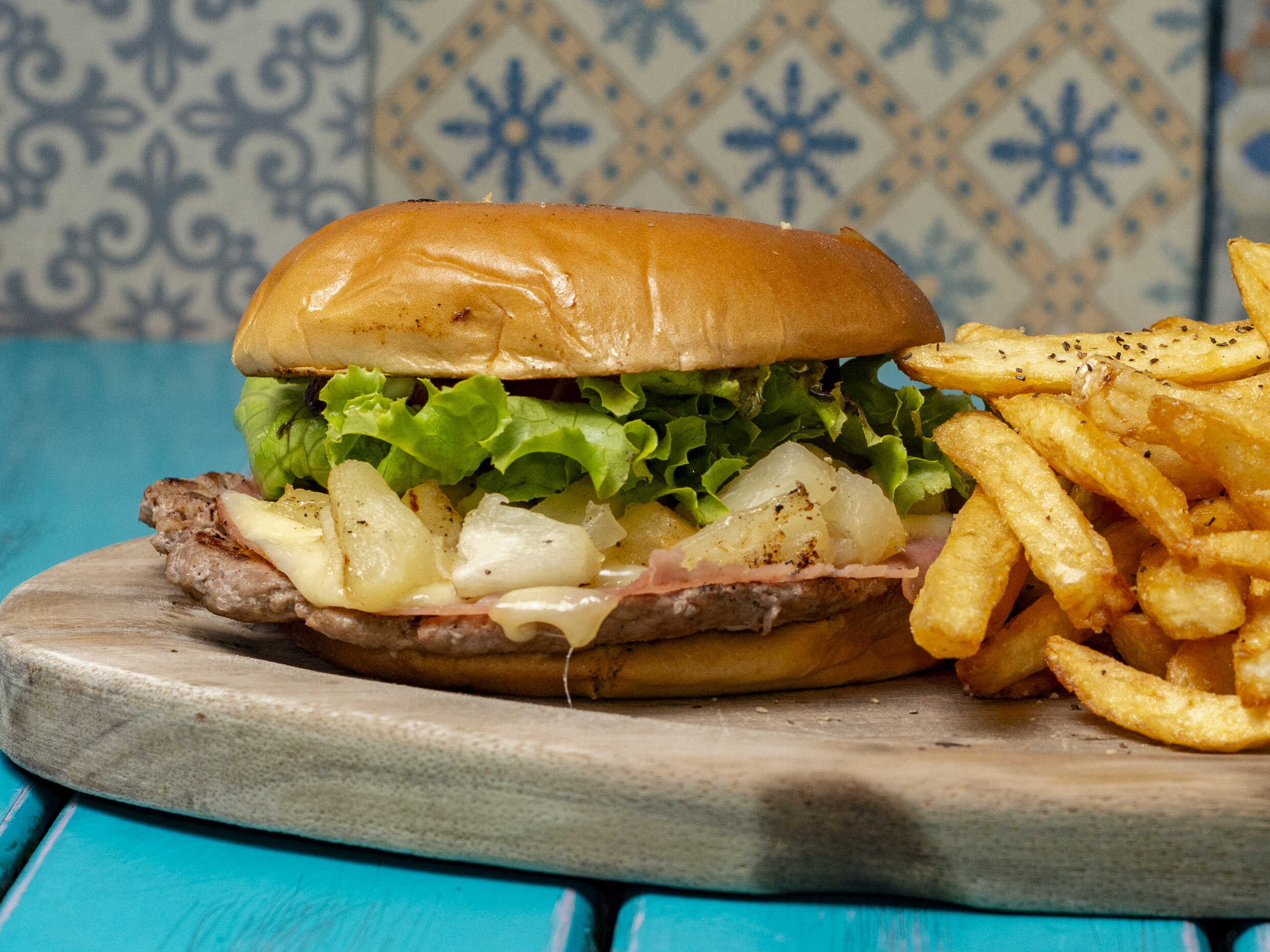 Pan, carne de res artesanal (150 g), jamón, piña, queso manchego, jitomate, lechuga, cebolla acompañado de aderezos (cátsup, mayonesa, mostaza y chile jalapeño) (No incluye papas)