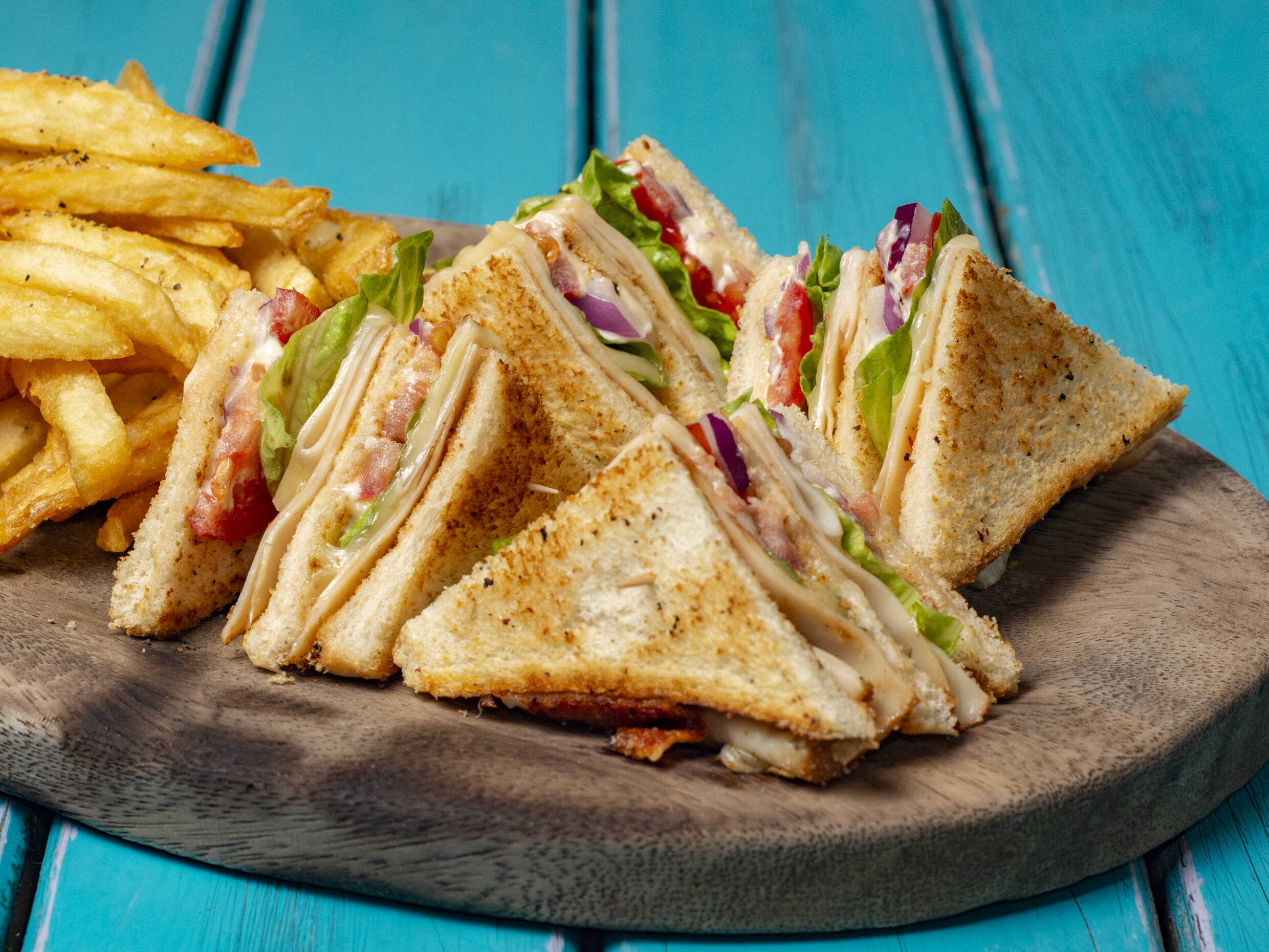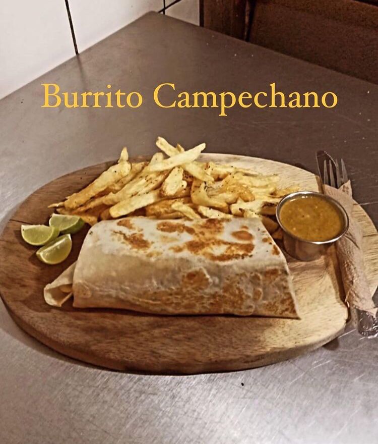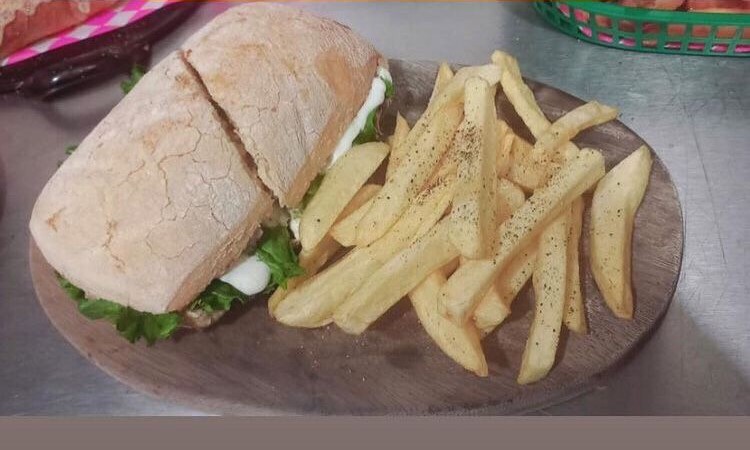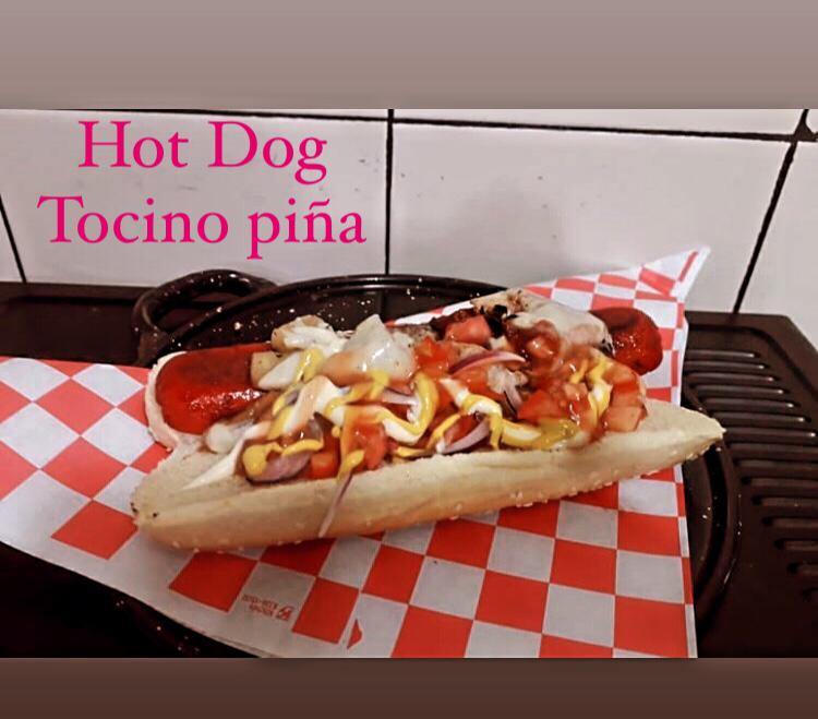 Pan, carne de res artesanal (150 g), jamón, piña, queso manchego, jitomate, lechuga, cebolla acompañado de aderezos (cátsup, mayonesa, mostaza y chile jalapeño) (No incluye papas)