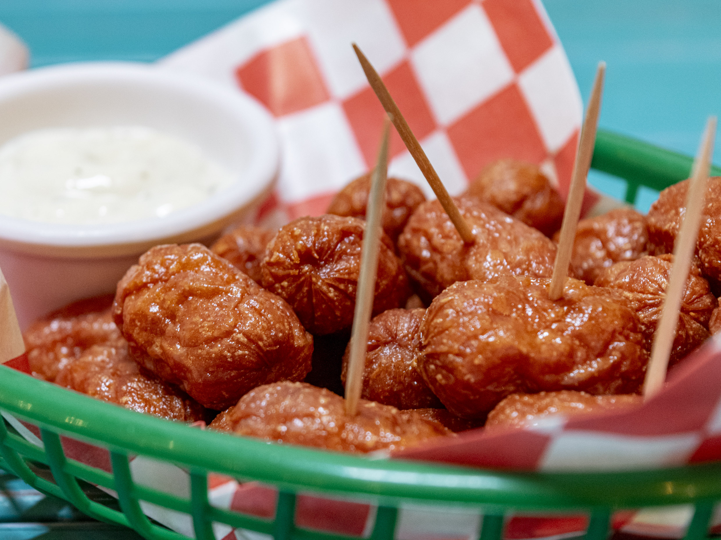 Alitas, palomitas de pollo, papas waffle y mini salchicha.