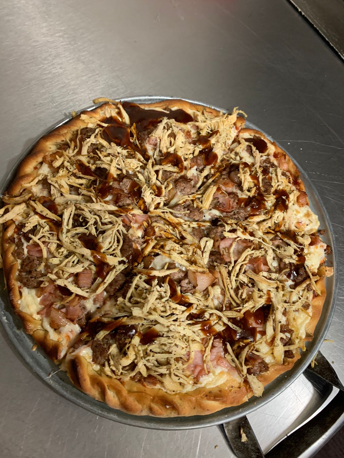 Salsa bbq, mozzarella, carne molida, pollo finas hierbas y tocino.