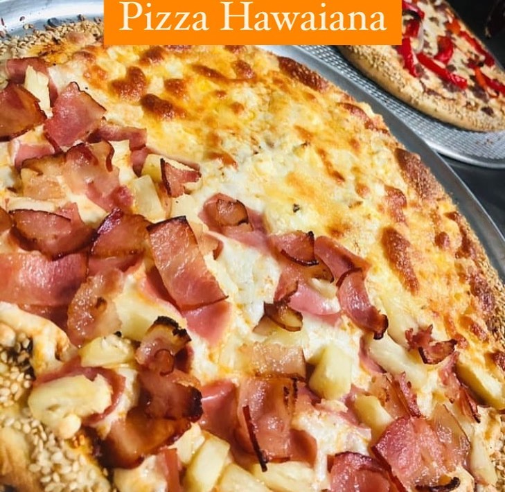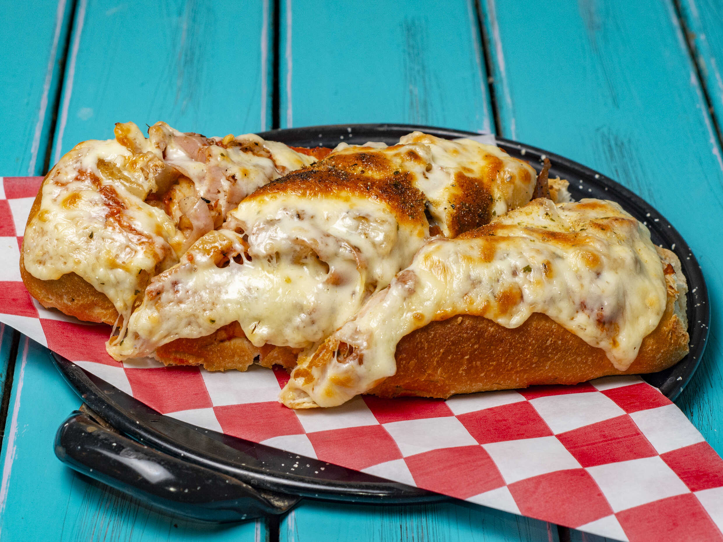 Barra de pan rellena de queso mozzarella, salsa de tomate, piña y tocino.