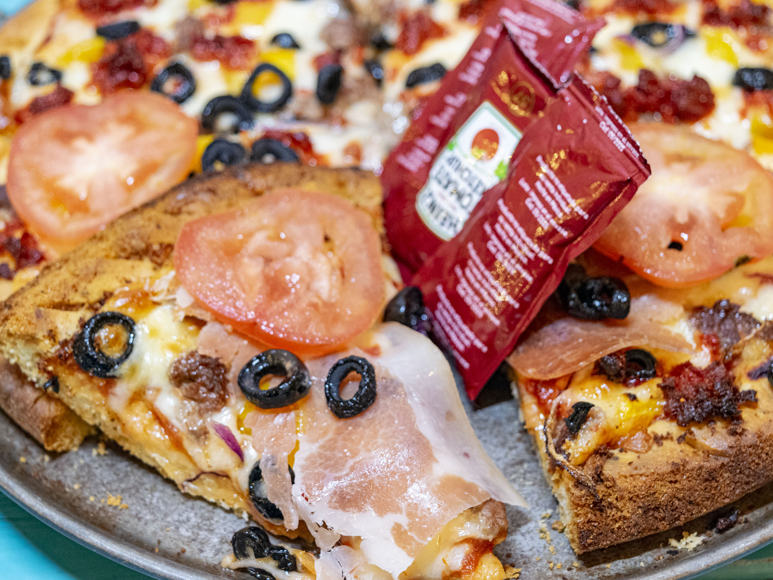 Mozzarella, jitomate, albahaca, aceitunas negras y jamón serrano.