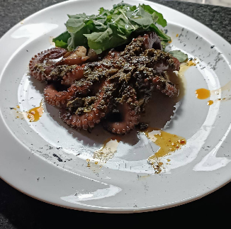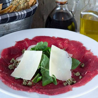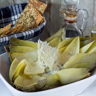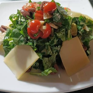 Arúgula, corazones de alcachofa, kalamatas, tomates cereza y laminas de parmesano.