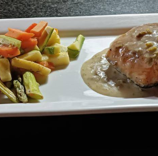 Lonja de salmón en salsa de alcaparras y guarnición.