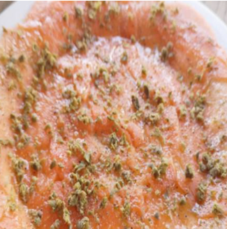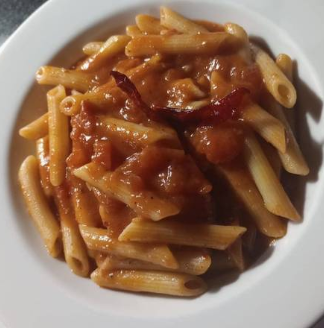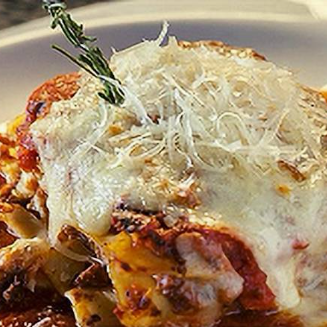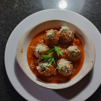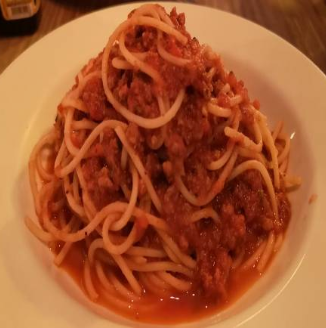 Salsa de tomate, carne de res y cerdo finamente condimentado.