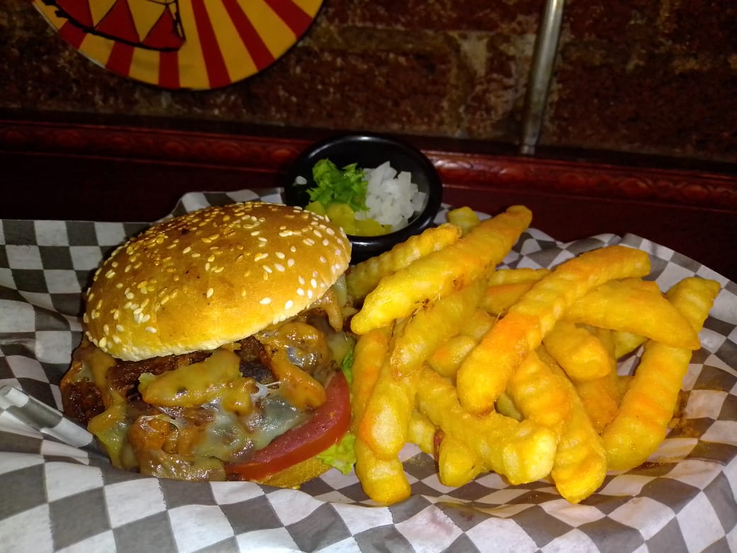 Carne de res, salchicha estilo alemán, queso gouda, aros de cebolla morada y aderezo de chipotle. Incluye papas a la francesa.