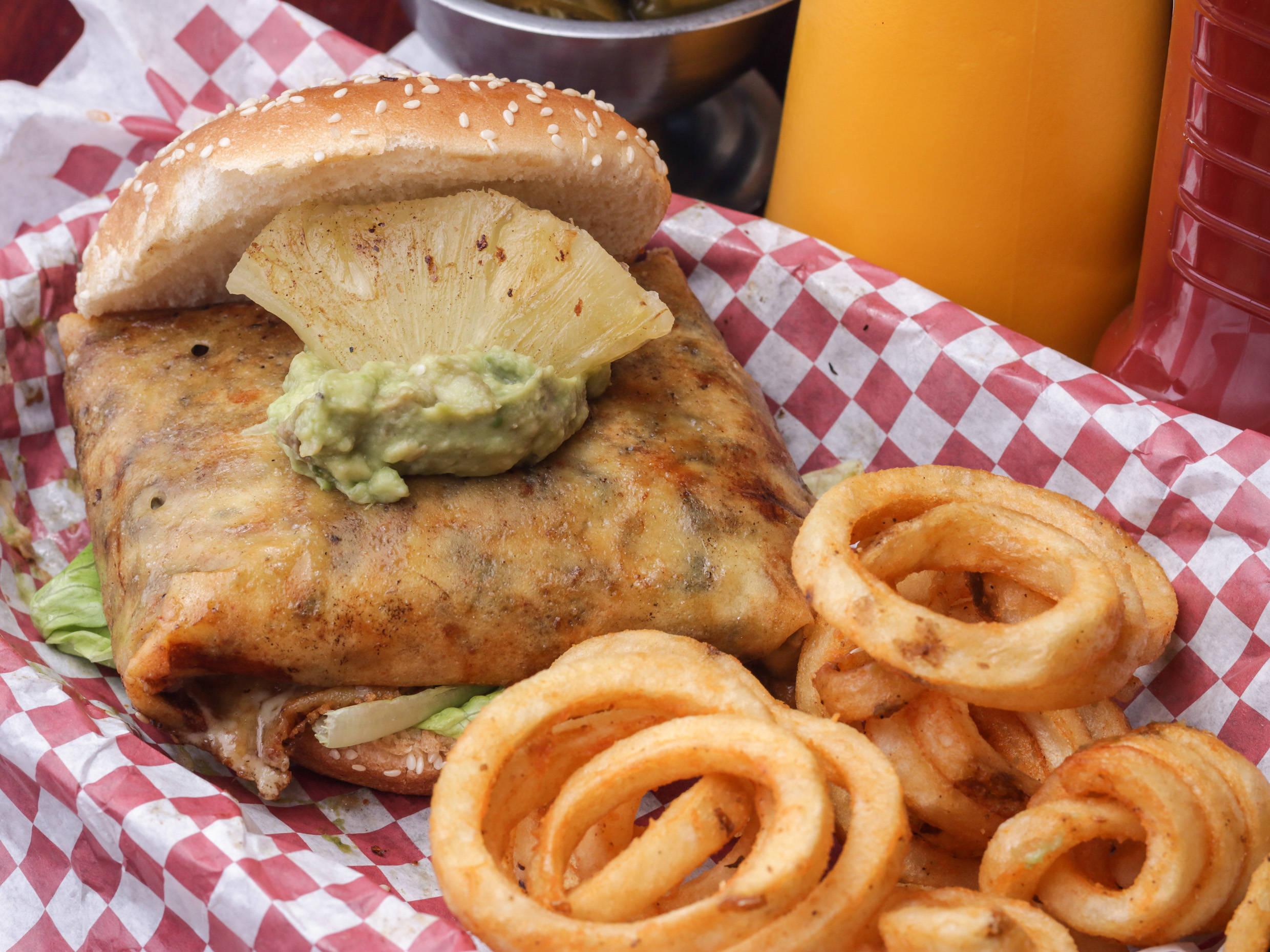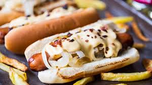 Salchicha alemana, queso gouda, aderezo de chipotle y aros de cebolla morada.