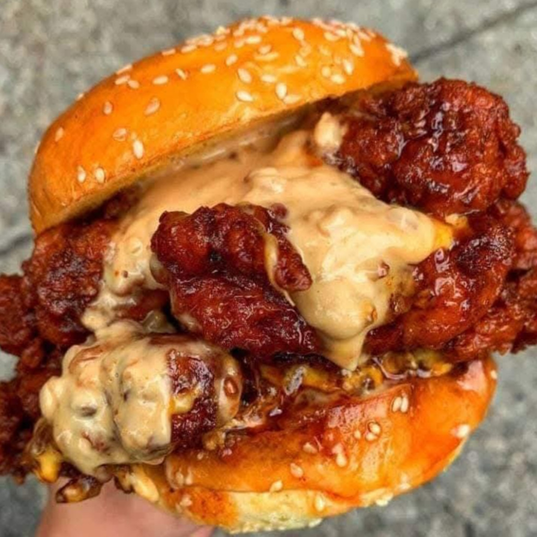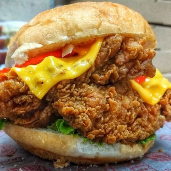 HAMBURGUESA CON 3 TIRAS DE POLLO CON SALSA A ELEGIR QUESO MANCHEGO Y ADEREZO MIL ISLAS MAS PAPAS
