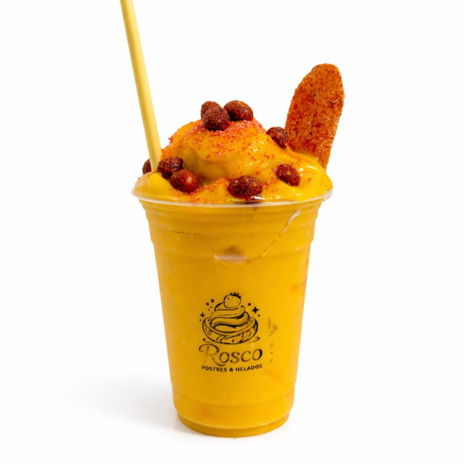 Rico Smoothie sabor Mango, a Base de Agua, con Rico chamoy, y mango enchilado y bolitas de chile!