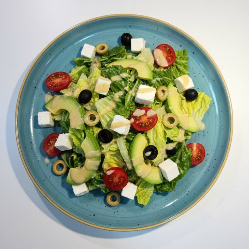 Lechuga, jitomate, aceitunas negras, aceitunas verdes, aguacate, queso panela y aderezo.