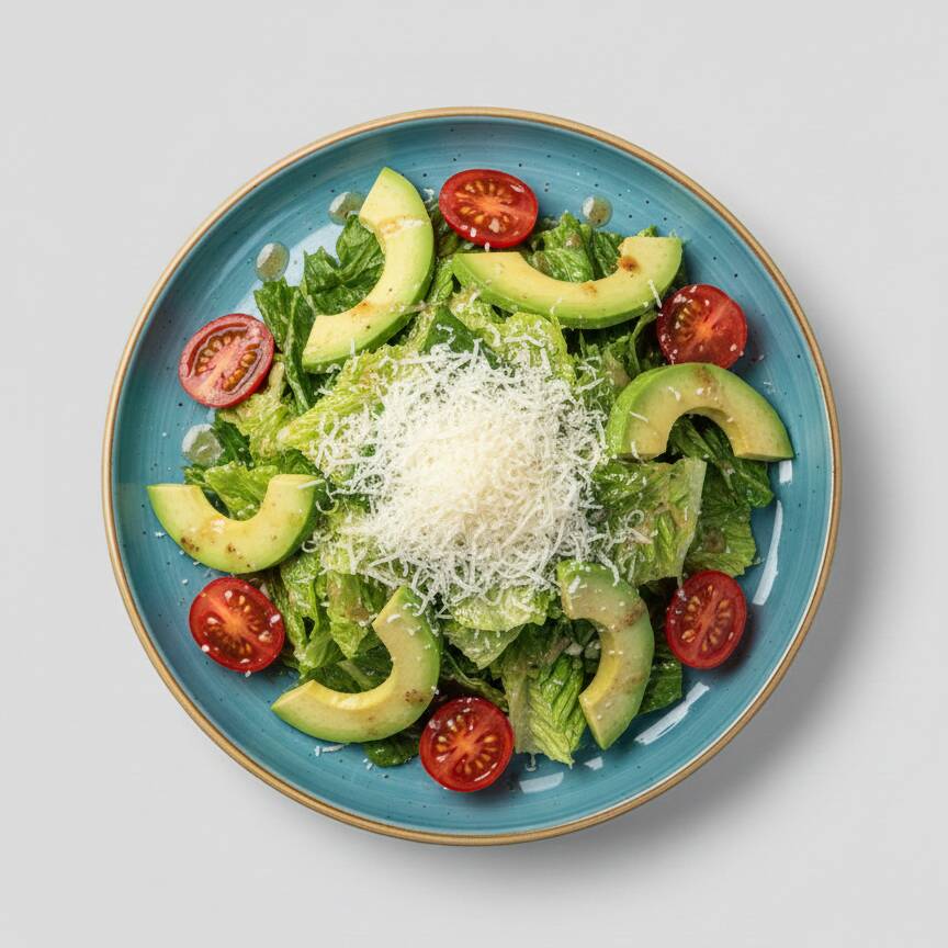 Ensalada con lechuga, aguacate, queso parmesano, jitomate y vinagreta de la casa.