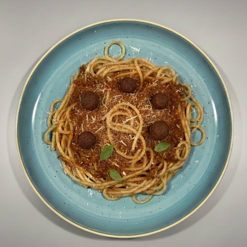 Pasta espagueti con ragú acompañado con albóndigas de carne de res.