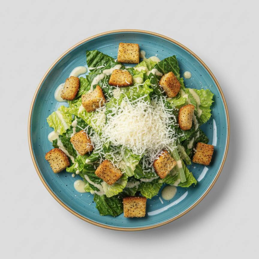 Ensalada con lechuga, crotones hechos en casa, aderezo de la casa y queso parmesano.