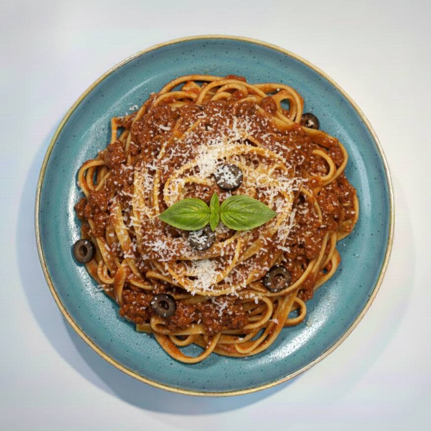 Pasta a elegir con salsa de carne a la boloñesa, vino blanco, aceitunas negras y queso parmesano.