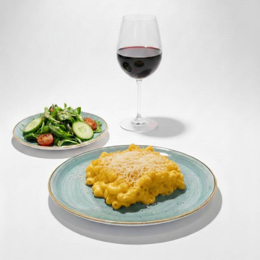 Macarrones con queso, ensalada del día y 1 bebida a elegir.
