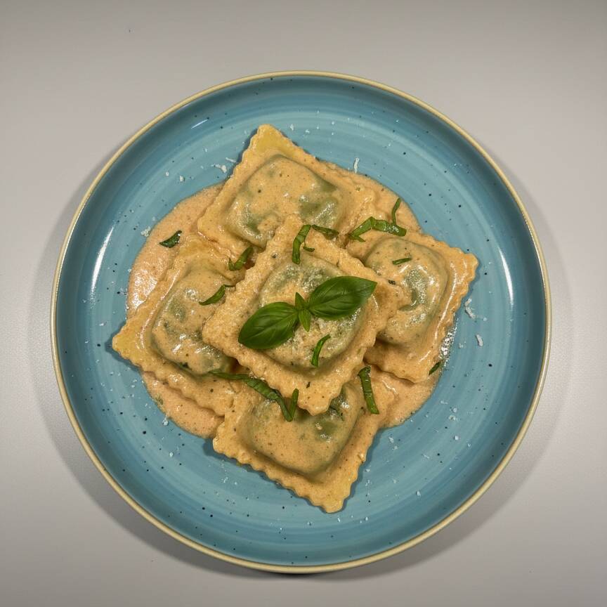 Ravioles hechos con pasta fresca, rellenos de queso ricotta y espinaca.