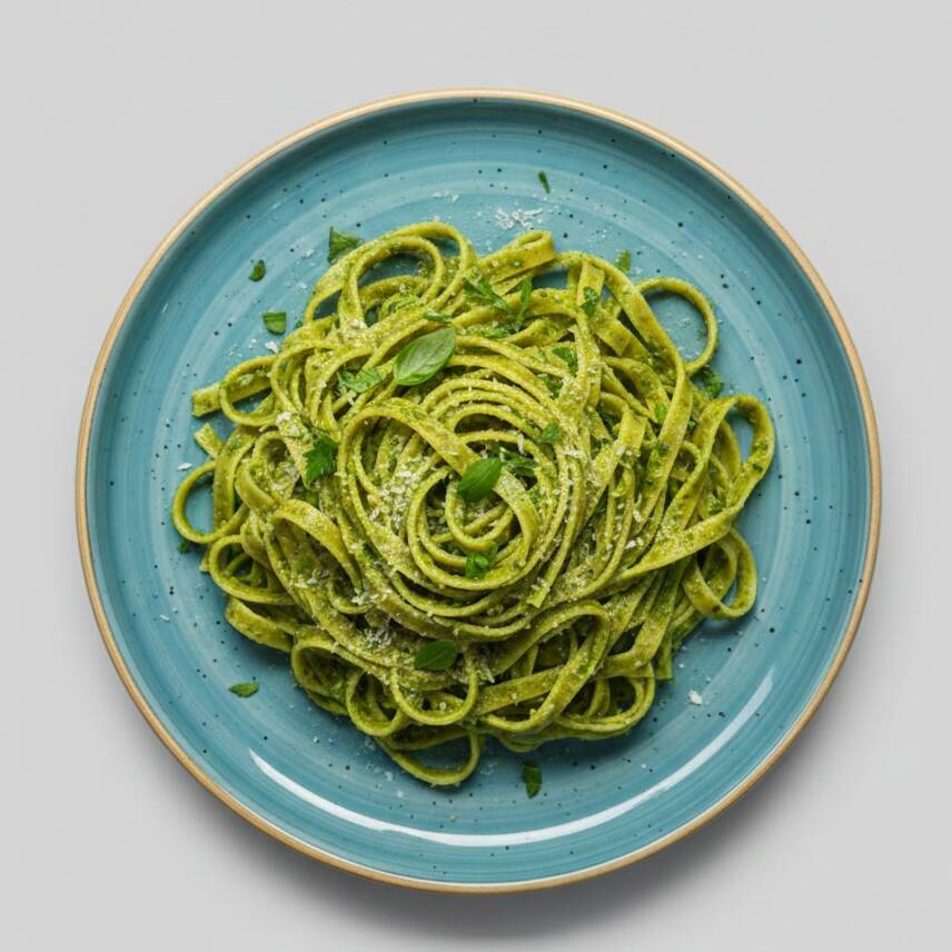 Pasta fetuccini con pesto hecho en casa, almendras y hierbas de la casa.