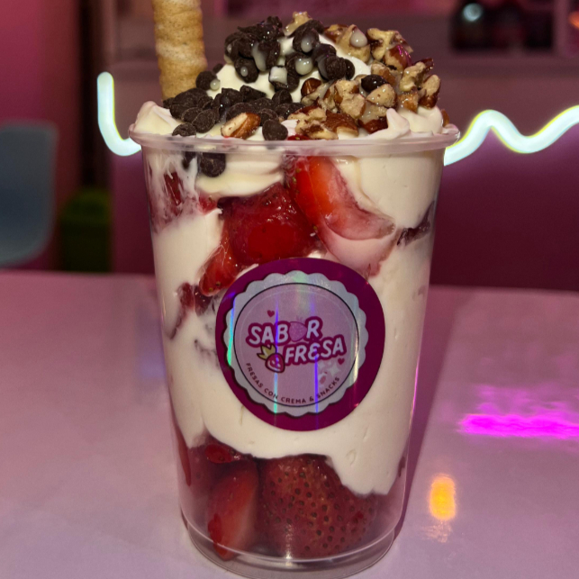 Fresas con crema de la casa y dos toppings a elegir