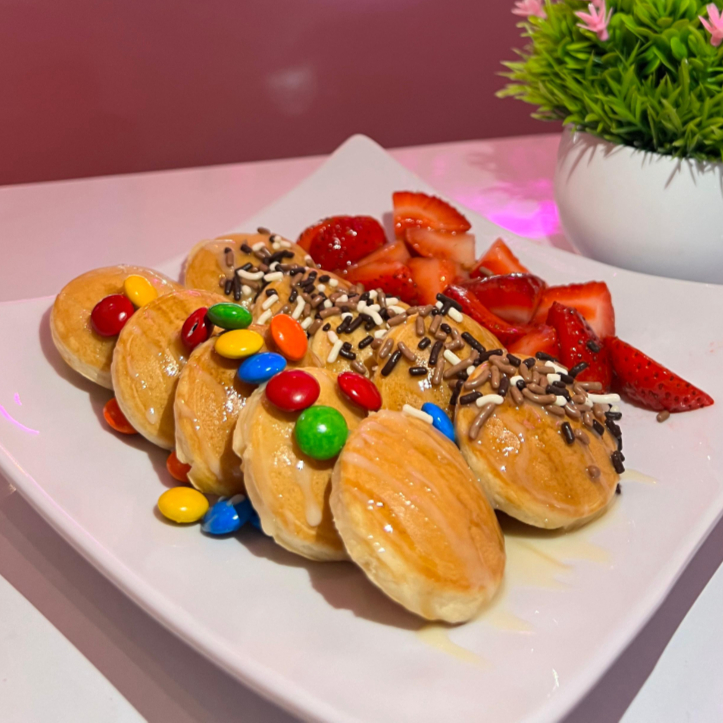 12 mini hot cakes acompañado de fruta y dos toppings a elegir