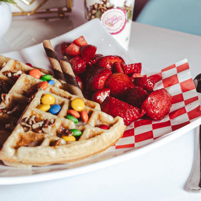 Waffle acompañado de fruta a tu elección y dos toppings