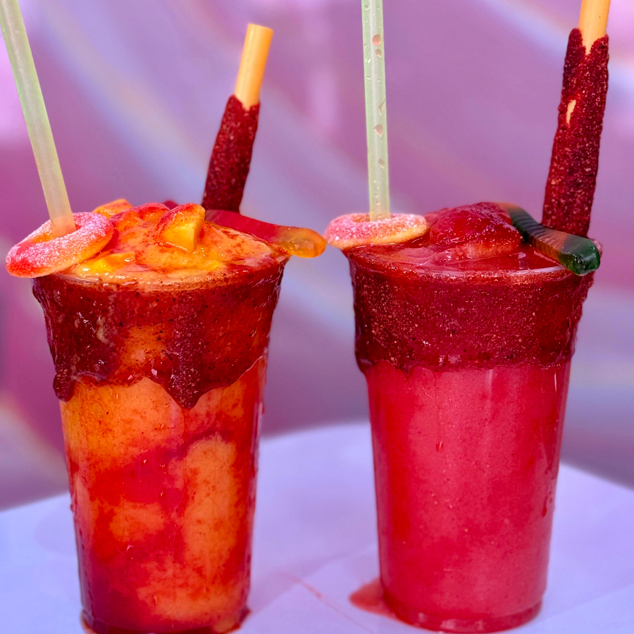 Bebida a base de hielo, fresa natural, chamoy y miguelito