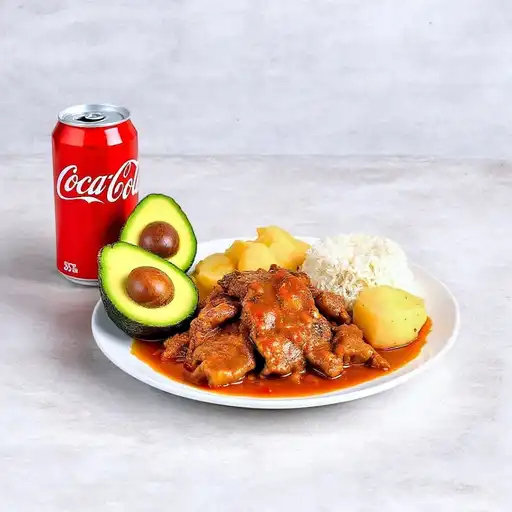 Jugoso trozo de carne de res bañado en salsa criolla, acompañado de arroz, papa, yuca sudada, aguacate y Coca Cola Original 355ml.