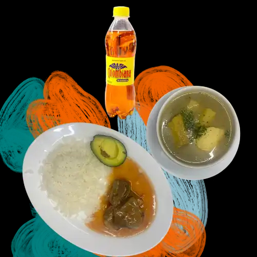 Costilla de res en salsa criolla con arroz blanco y aguacate, caldo de papa, yuca y plátano verde y Colombiana.