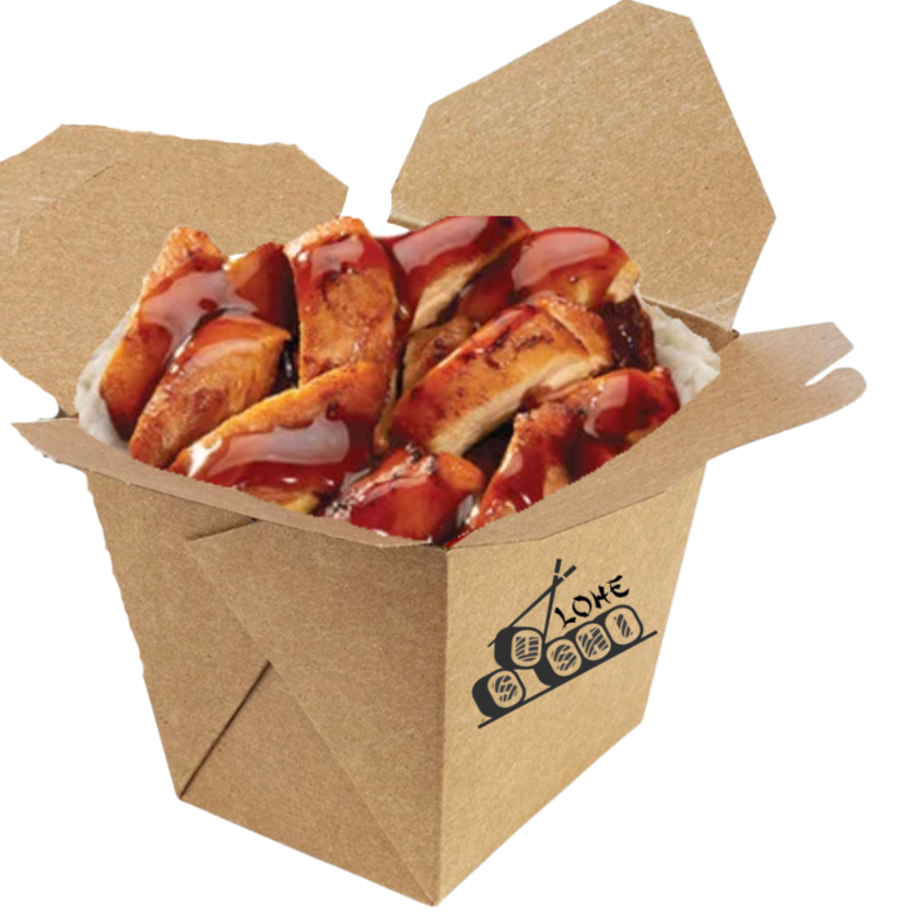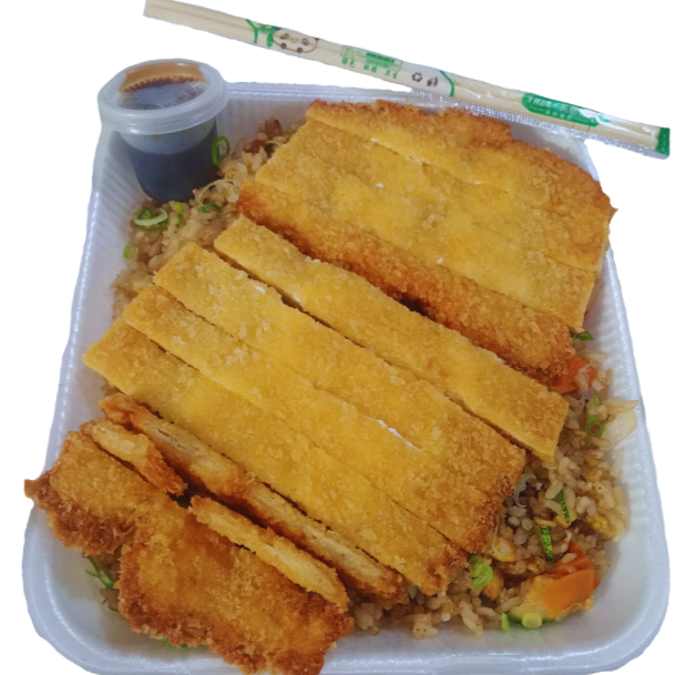 Pechuga de pollo empanizada (estilo milanesa o katsu) rellena de queso Philadelphia o queso manchego. Crujiente por fuera y fundido por dentro, servido con arroz frito (yakimeshi), bastones de pepino, zanahoria y una salsa a elegir.